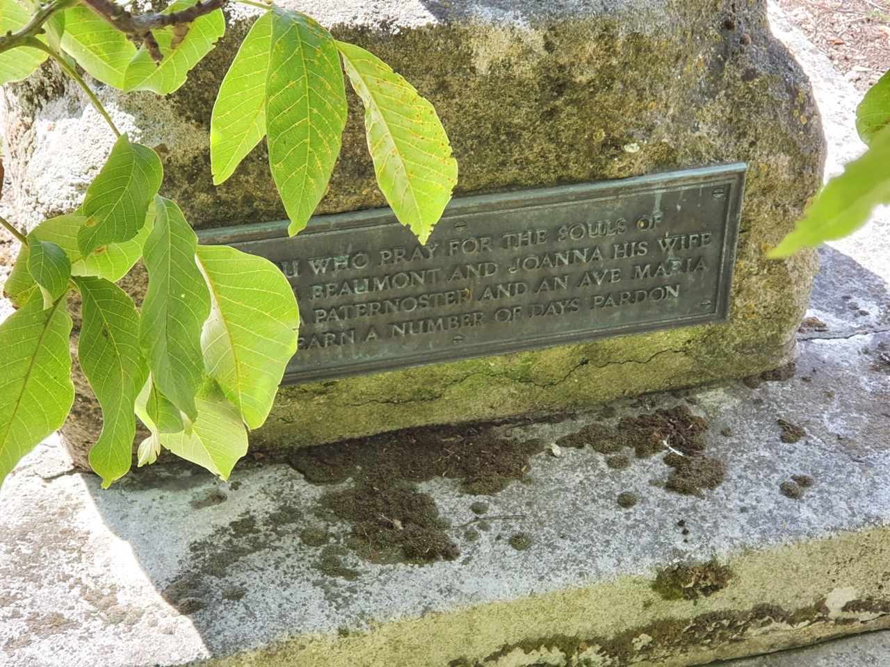 “Vous che prie pur l’am William de Bellomont, === Johanne sa femme, === Pater Nr === Ave Maria, === de pardona avera.”