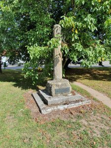 The bronze plaque, with an English translation of the original French wording that was on the cross. Although two of these plaques remain, the other two have fallen off at some point and become lost.