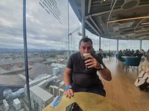 Well, indeed…… It’s possible to have a beer included and sit in a bar elsewhere at the site, but one of the highlights is sitting in the Gravity Bar and so we paid a bit more for that. We were seated by the window which was really rather lovely, with excellent views over the city and the hills.