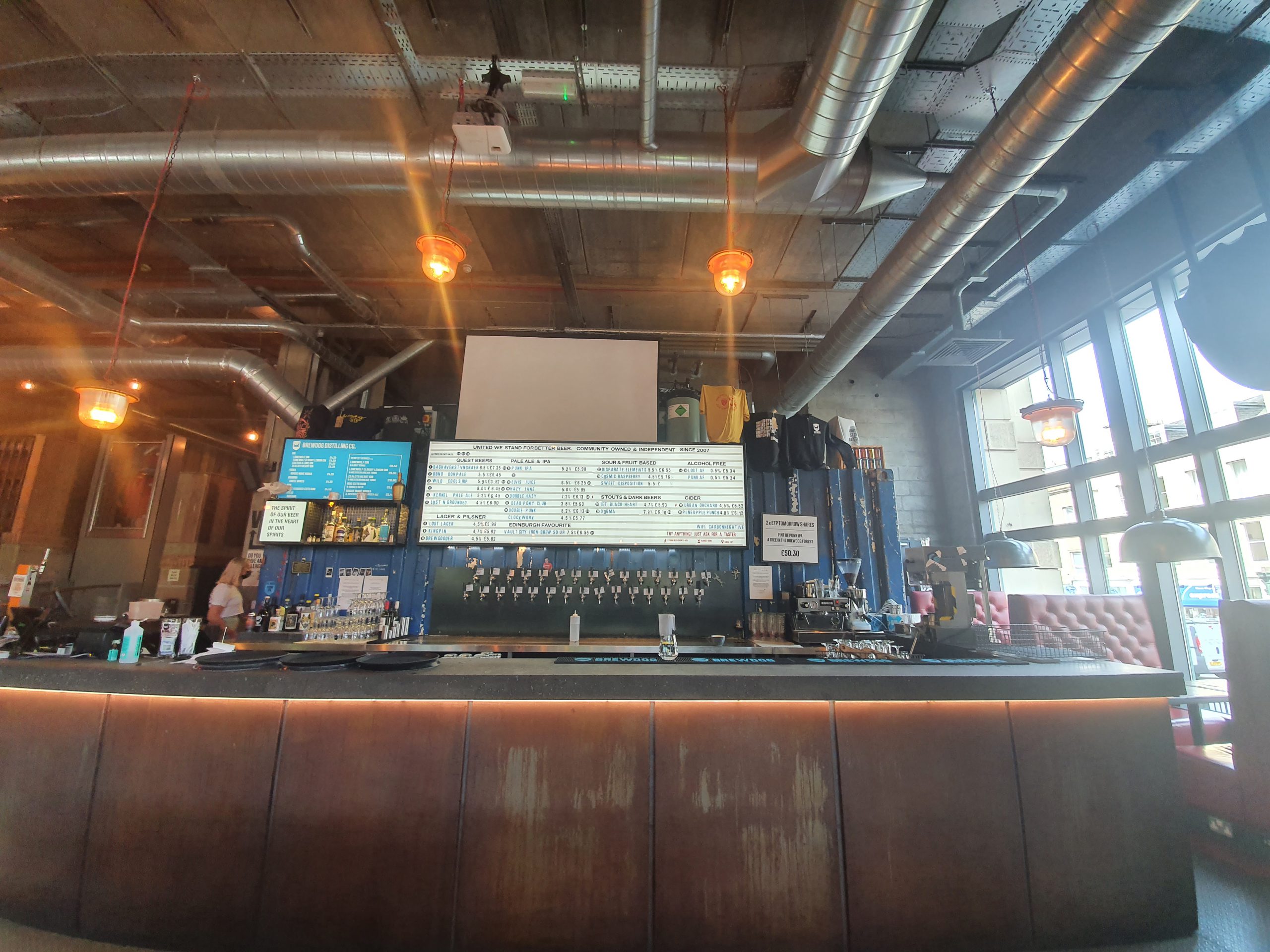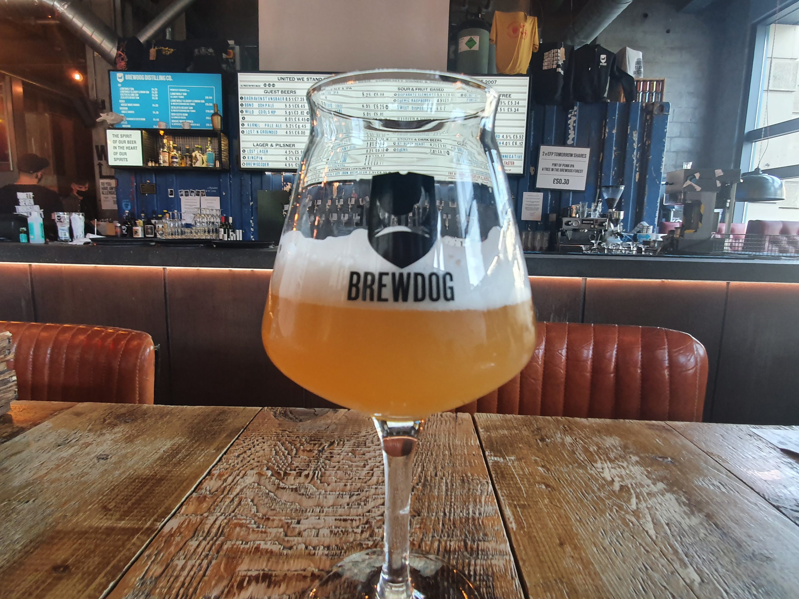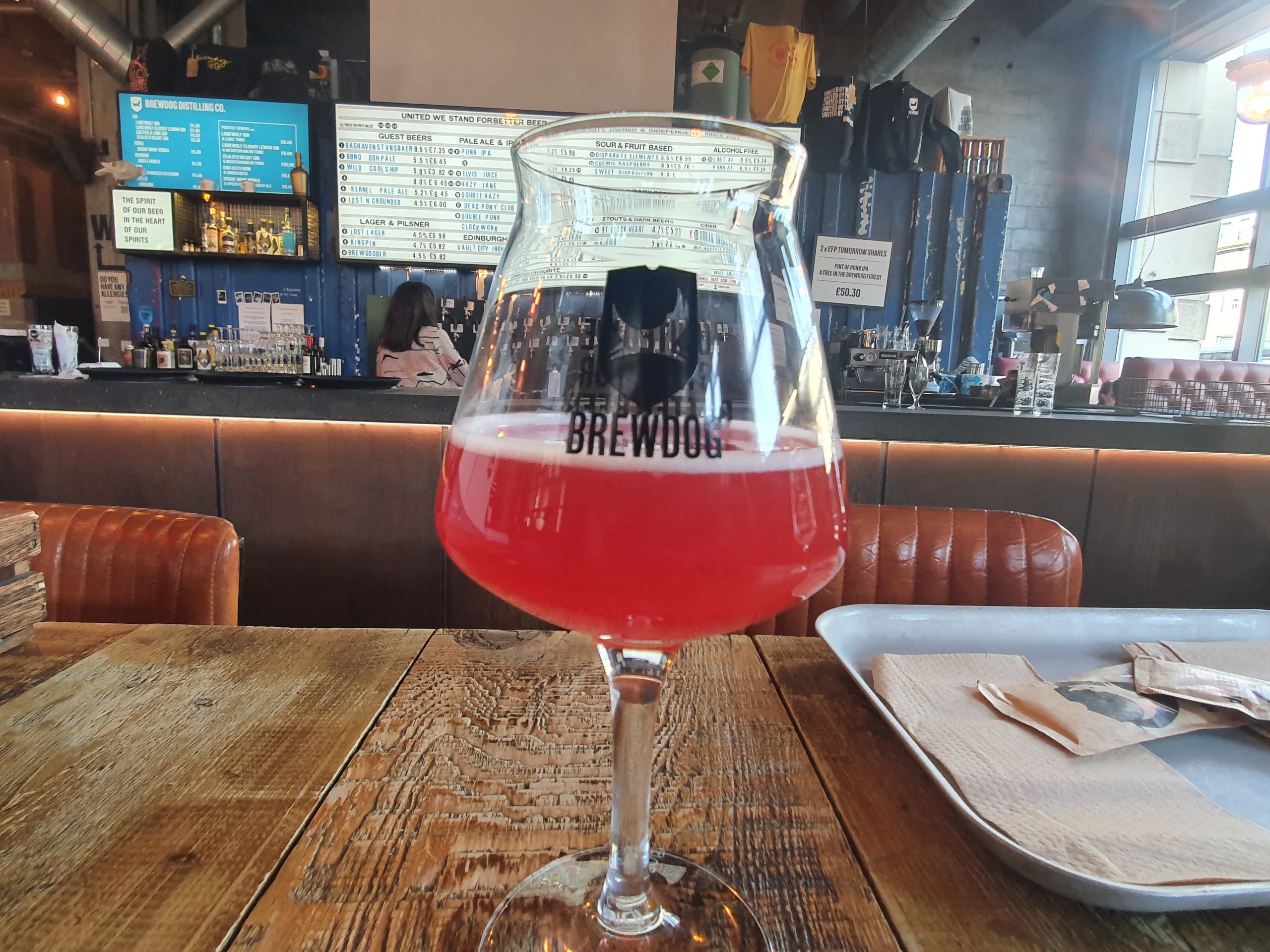I was seated near to the bar, in what I considered to be a rather good location since I could see what was going on. The welcome seemed genuinely friendly and the staff members were always polite, but they weren’t pro-active in talking about the beers in a way that some other Brewdog bars have been. But Brewdog set themselves a high bar in terms of their engagement, so there was nothing wrong here, just other venues in the chain have their staff talk about the beer in quite a natural way even when customers have already ordered it via the app.