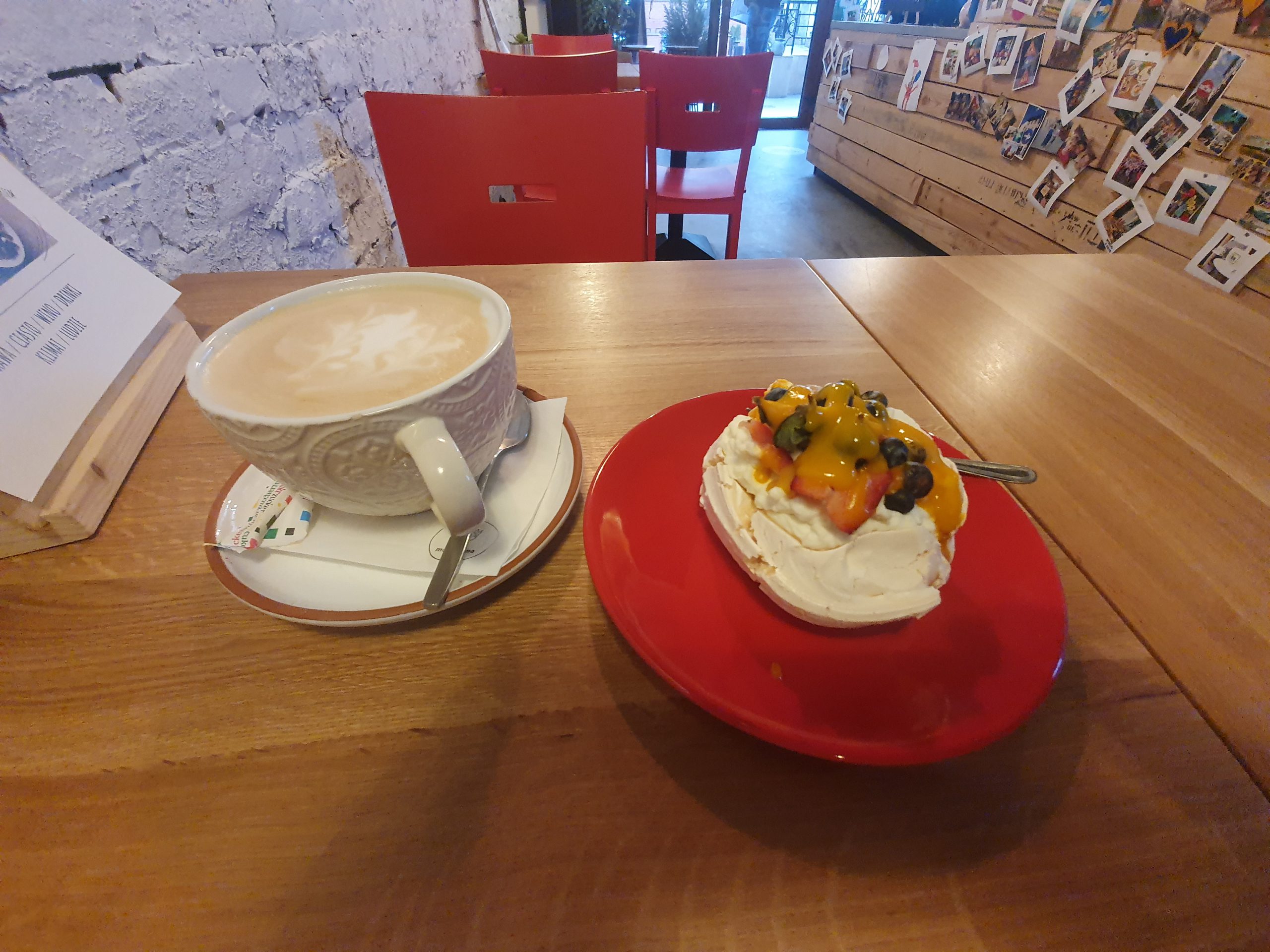 I went for a large latte and a rather delicious meringue with fruit on top. I was entirely delighted with my healthy fruit option, with what I think was a mango puree and the firm exterior of the meringue and the melt away inside added some sweetness to the arrangement. All nicely presented, although they probably need new cups as they’re slightly chipped.