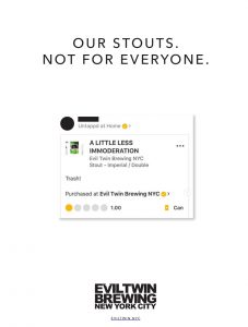 This is a full-page ad in Craft Beer & Brewing magazine, and it’s beautiful. I’m not sure how anyone can leave a 1-star rating on Untappd for anything that Evil Twin Brewing produce, but, perhaps it’s not for everyone as they say. But, Evil Twin is one of the best breweries going, so they can definitely get away with advertising like this. It is annoying me now that I haven’t had enough of their beer though, I need to get out more…