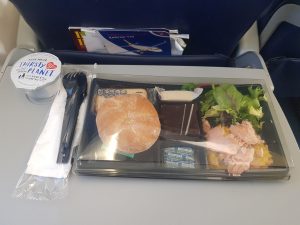 The food was much better than I had expected, it was salmon on rice, along with a side salad, roll, cheese & crackers and a chocolate dessert. There was also a water thing served with it, although it was easy to get extra drinks from the bar from passing crew members.