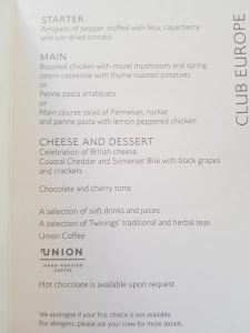 The whole cabin service was efficient and pleasant, with the cabin crew being pro-active in offering extra drinks. They were so pro-active with me they asked if I wanted a second champagne and I hadn’t had a first, but it seemed rude to decline at least one glass. BA have switched from serving champagne in mini bottles to using full size bottles and it was Champagne de Castelnau (I didn’t know this from just the taste obviously, it’s printed on the menu).