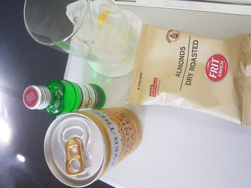 The pre-meal snack and drink. My second alcoholic drink of the year, a gin and tonic. It came with ice and lemon, and it tasted like I expected gin to taste. Unfortunately, I have no special knowledge of gin to even be able to try to explain it.