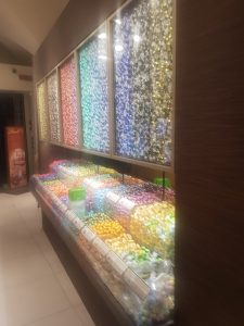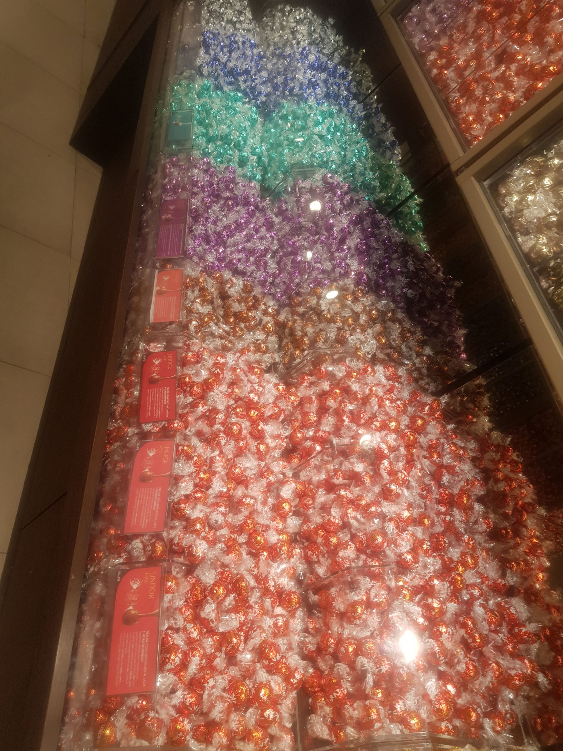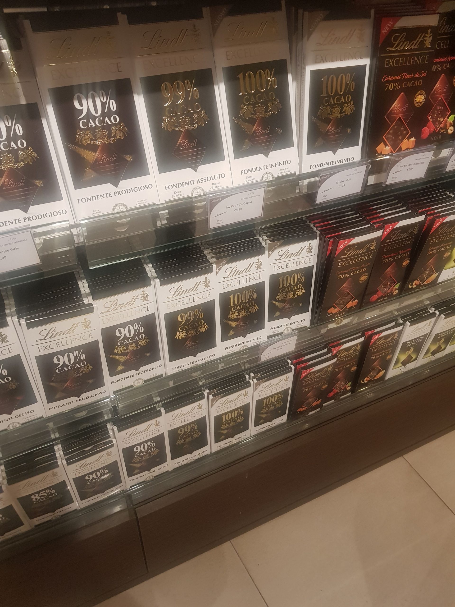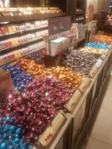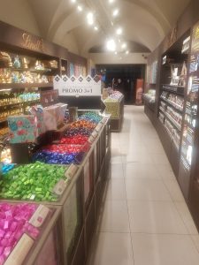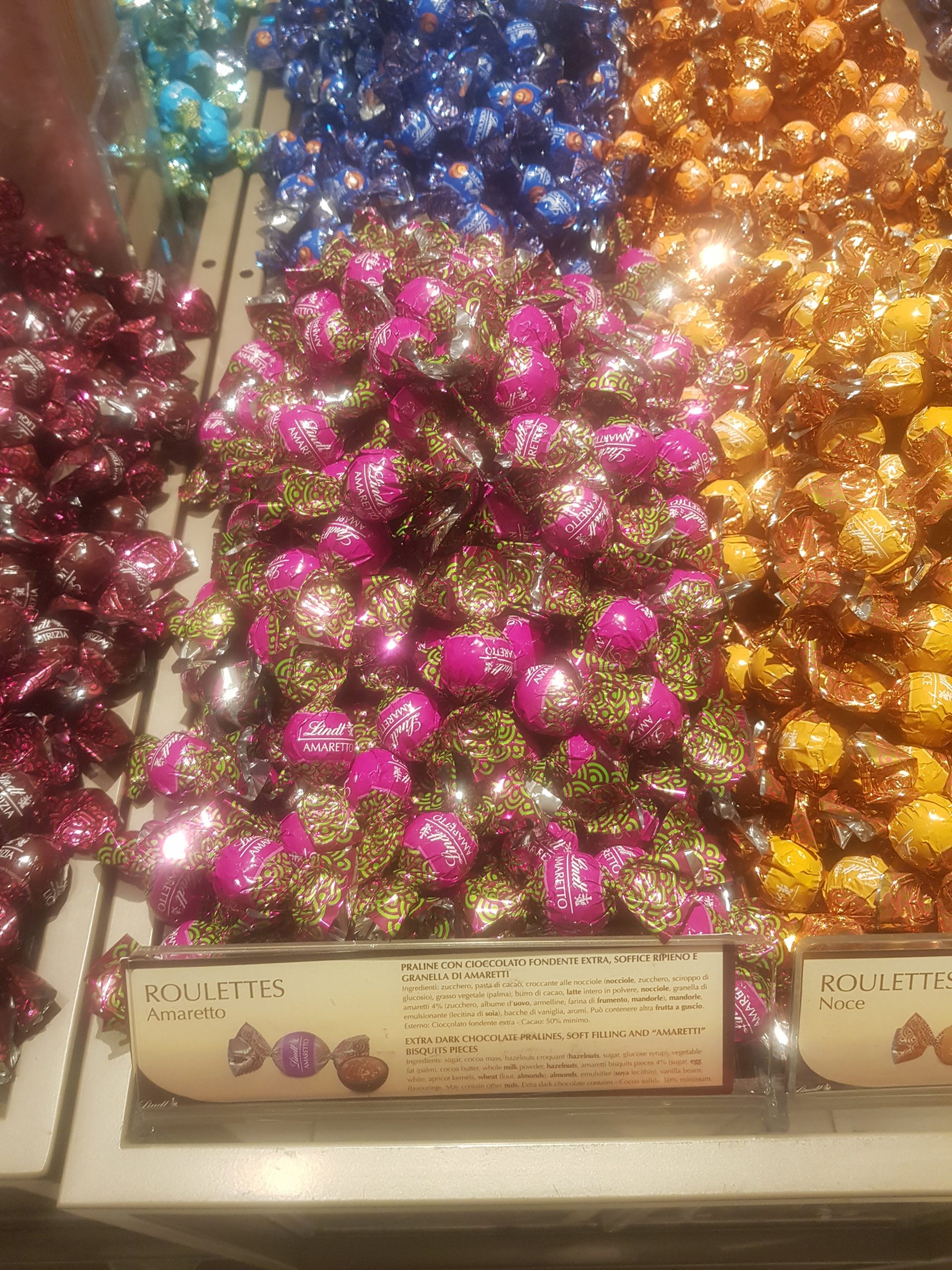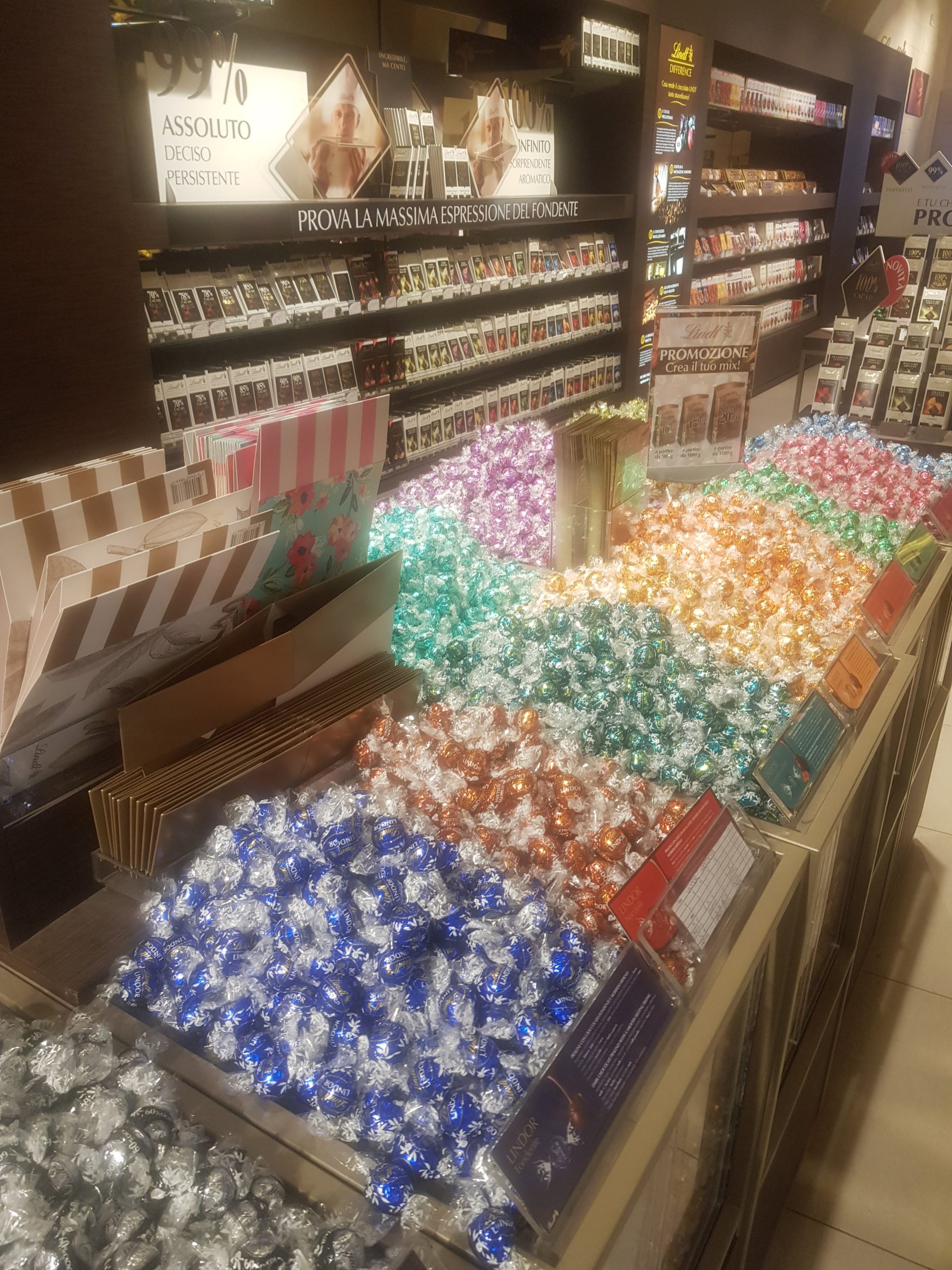 When we were meandering around in the evening, we stumbled across the Lindt Store, centrally located in Florence near to the Cathedral. It looked exciting with the vibrant colours and it was even more exciting when we got a free chocolate when we entered the store…..