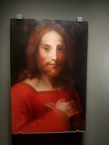 Dating of the painting to one side, it’s a copy of the artwork painted by Andrea del Sarto in around 1515 for the Santissima Annunziata. This copy was commissioned by Vincenzo Borghini, a Benedictine monk who was the rector, or prior, at the Ospedale degli Innocenti from 1552. To my untrained eye, the painting of the face looks a little crude, but the colours remain rather vibrant and the face of Christ looks warm and compassionate.