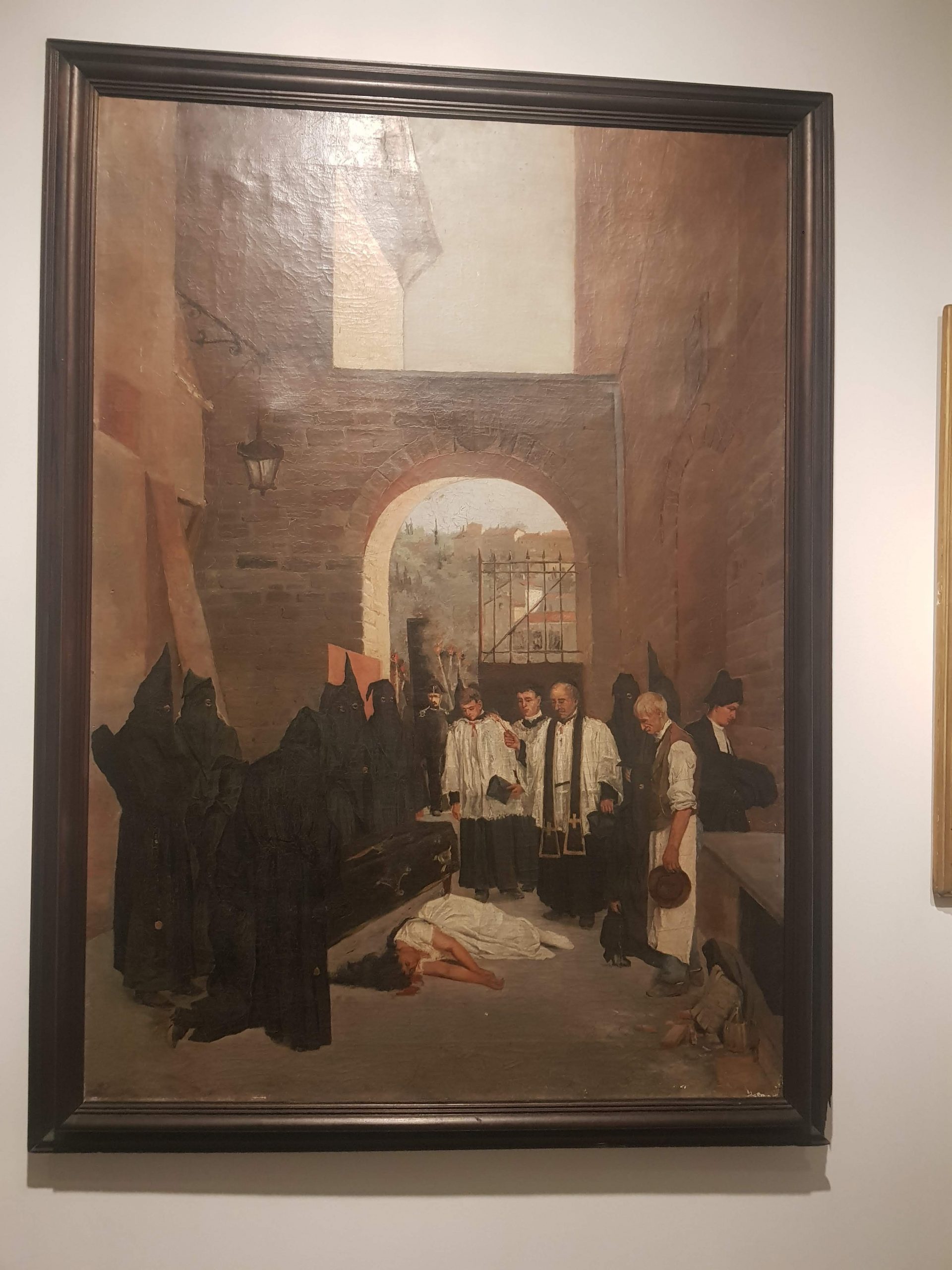 Anyway, it’s that requirement for anonymity that is behind this painting of the charitable work which the members of the Brothers of Mercy were responsible for. To this day, the charity is still engaged in helping the injured and sick, providing social transport, medical help at sports matches and home care. This artwork is by Pittore Fiorentino and was painted in the second half of the nineteenth century. At first, it all looks a bit sinister, it’s only when looking for longer that the selfless acts of kindness are noticeable.