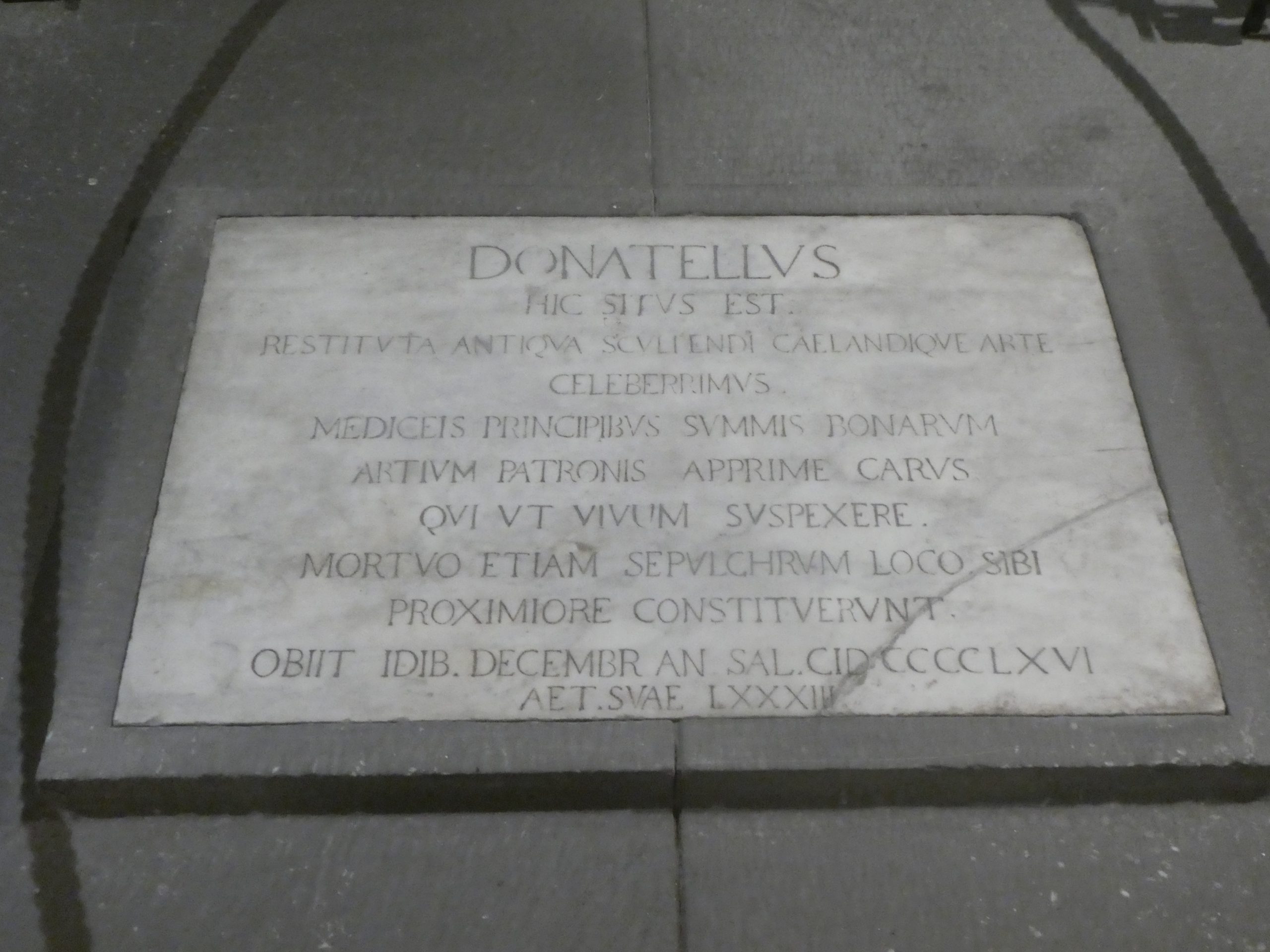 “Here lies the body of Donatello, celebrated for reviving the ancient art of sculpting, most dear to the Medici Princes, generous patrons of the liberal arts who, as they revered him while he was alive, so they erected a tomb for him after death in a place close to their own.”