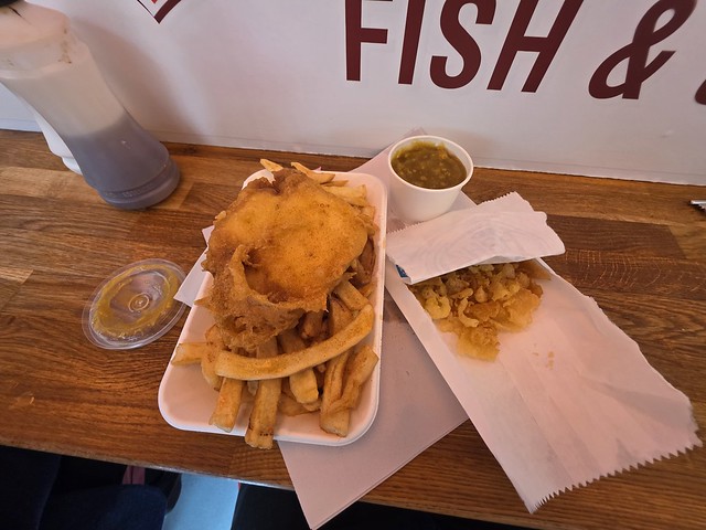 The cod was larger than I expected and they had forgotten the scraps (which I insist on calling them, although they call them crispies at the stall), but willingly added them in a bag on request. The bottom of the cod was perhaps a little soggy, but the fish flaked away and had a depth of flavour. The batter had some crispiness to it and a pleasant taste, whilst the chips were firm on the exterior and suitably fluffy on the interior. The curry sauce was also served as a generous portion and added to the whole delicious arrangement.
