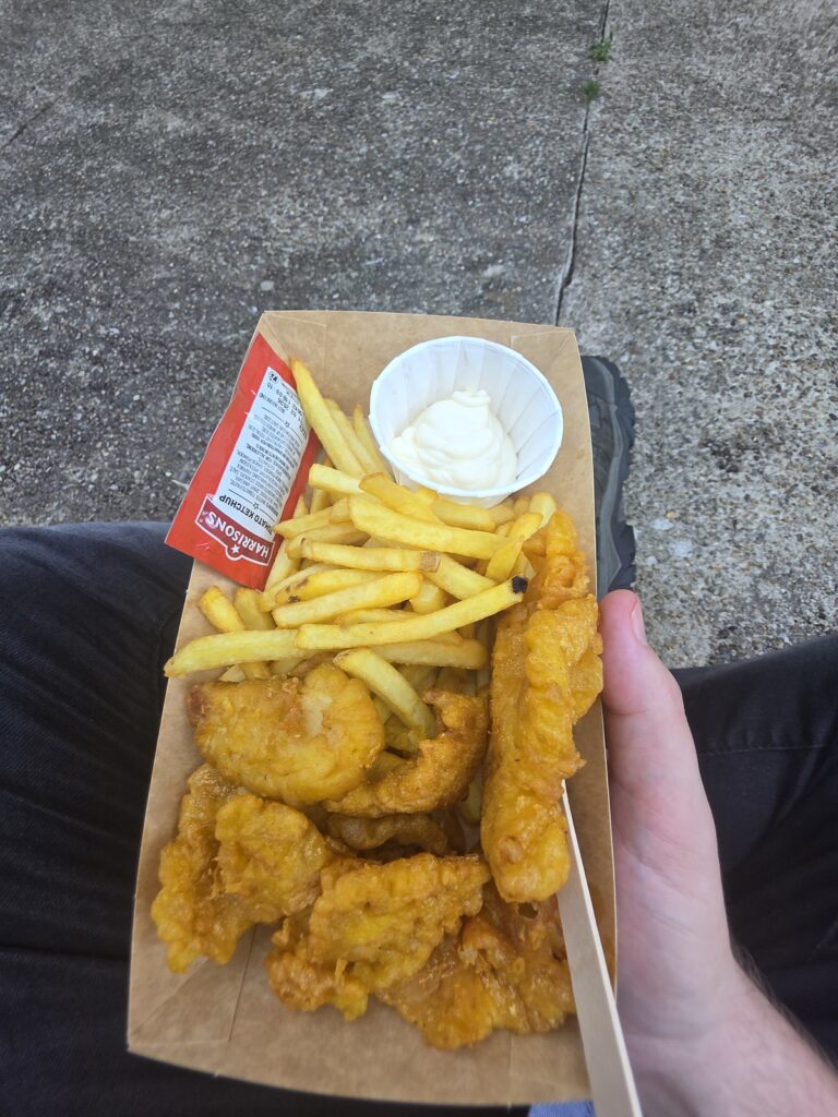 We found a bit of grass to sit on in the shade, which more suited me as I like being firmly in the cold, although James is quite middle class and was hoping for seating. He didn’t complain though, he had chicken. And, as James mentioned, this meal tasted like the chicken balls in Chinese takeaways, which to me and him is a very good thing indeed. I suppose there could have been just a few more fries, but I was happy with the number and they were freshly cooked. The chicken was served as a generous portion and the mayo and ketchup is supplied free of charge. Everything was at the appropriate hot temperature and I thought that there was an effort made with presentation bearing in mind it’s chicken and chips. I thought for £5 this was definitely comparable to other similar venues, with the can of drink being £1.50 which was also not unreasonable.