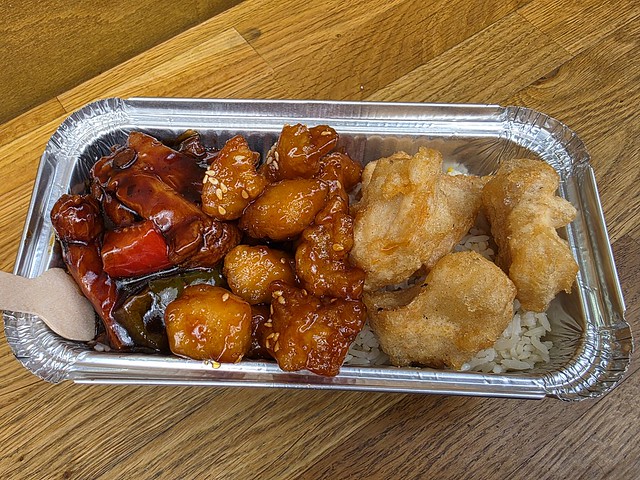 The food offerings aren’t huge in number, but they had a suitable number of chicken permutations for me. There was a choice of chilli beef, chicken curry, chicken black bean, sesame chicken, sweet & sour chicken, salt & pepper chicken and fried vegetables. There is also the option of adding on chicken balls or spring rolls. The service was polite and efficient with a relatively brief wait in the queue. The nature of the service means that there’s no wait for the food as it’s served up immediately when ordering.