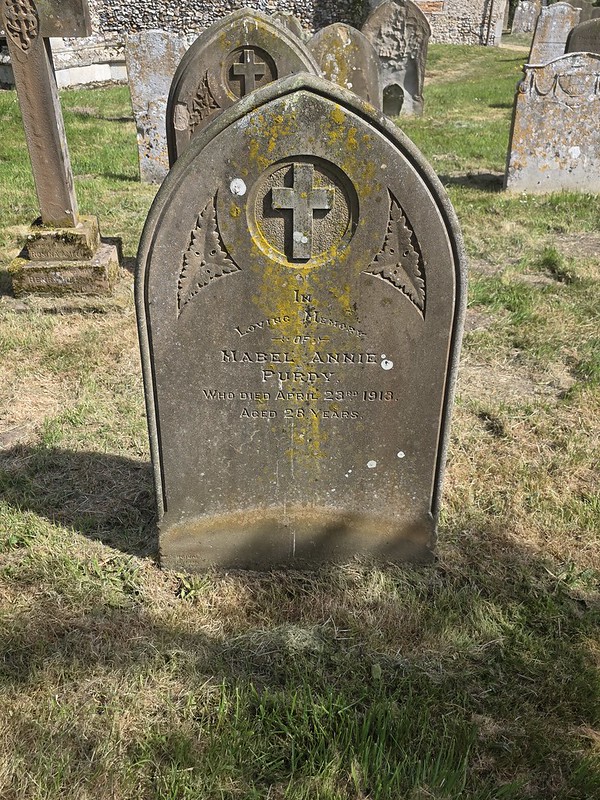 This grave at the Church of St. Thomas the Apostle caught my eye as it commemorated the life of Mabel Annie Purdy who died according to the gravestone at the young age of just 28. I was initially confused as the church’s birth register notes that a Mabel Annie Purdy was born on 25 November 1882 and baptised on 15 February 1883. However, I then noticed a birth of Mabel Annie Purdy on 7 August 1883 and baptism on 26 October 1884, so I assume the first little girl died and they wanted to give their next child the same name. Both girls were the daughters of Henry Purdy, a publican, and Rosina Purdy (nee Connell). The pub that they ran was the Chequers in the village, which closed in 1968, but apparently the pub sign remains in place so the building on Stocks Hill remains. Henry was a farmer and he was the licensee of the pub between 1863 and very early in 1913, when he died, which is quite a tenure.