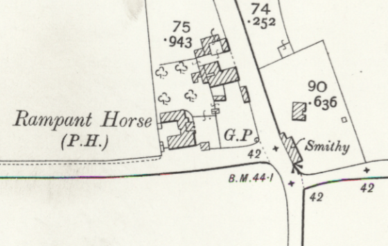 The pub was advertised for sale in 1885 and the auction particulars mentioned that it had stables, yards, a covered skittle ground and a large club room. GP in the above Ordnance Survey map from the 1880s means guide post and it’s evident that there was more space available to the pub then. Today, they have only a small car park and those yards have long since been sold off.