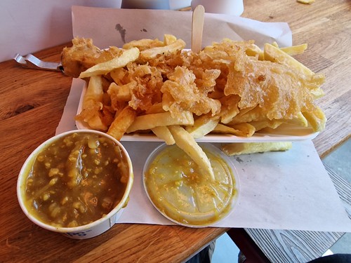 I didn’t need to make this post, as it’s just more of the same from my not very exciting to write about day. My day involved a lot of sitting about in various places with my laptop (which was very productive fortunately), but I had a desire to upload this beautiful photo from Lucy’s at Norwich market. Large butcher’s sausage, chips, curry sauce and a heap of scraps. There surely can’t have been a better time to be alive.