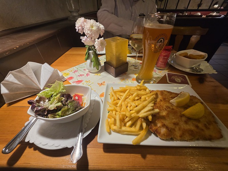 There was some hammering in the background from what I assume was the kitchen and that was the authentic sound of schnitzel preparation, so that was me won over. Richard debated what wine he would get, as he’s getting good with knowing his grapes now, whilst I went for a reliable wheat beer.