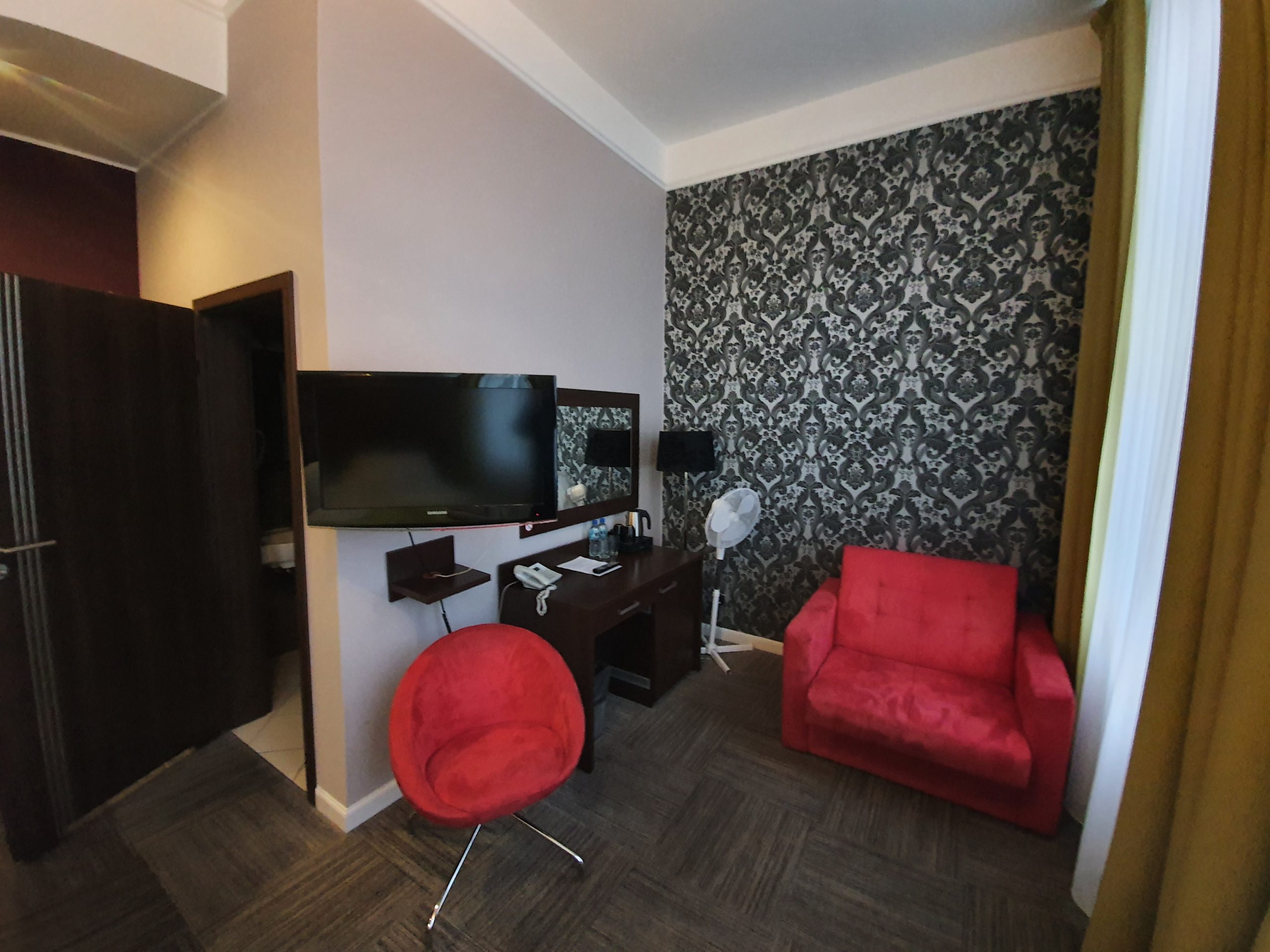 The sitting area of the room, all modern and contemporary. The light at the rear didn’t have a bulb in and the bathroom sink didn’t have a plug, but I didn’t let these factors concern me.