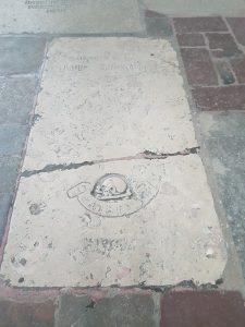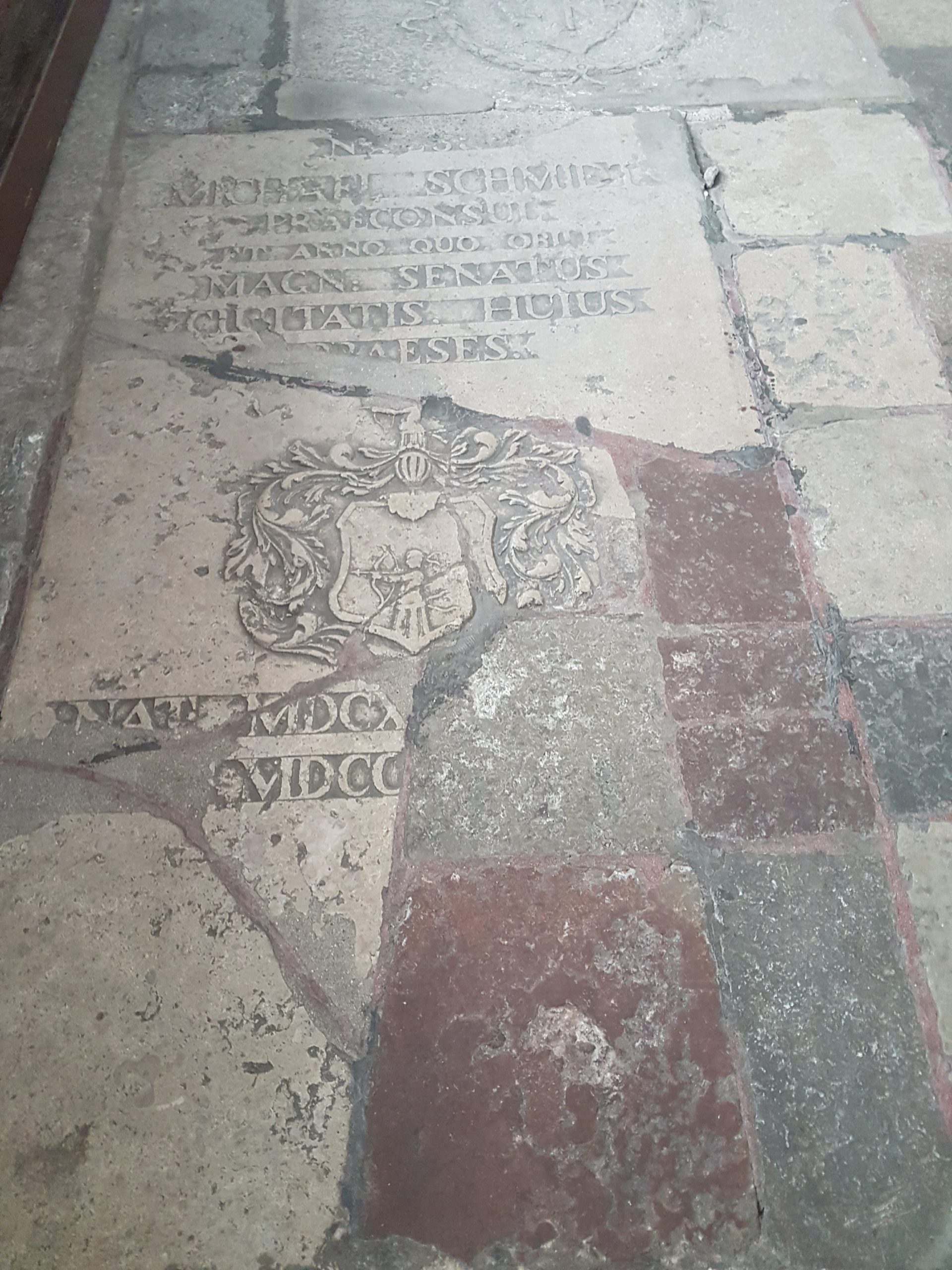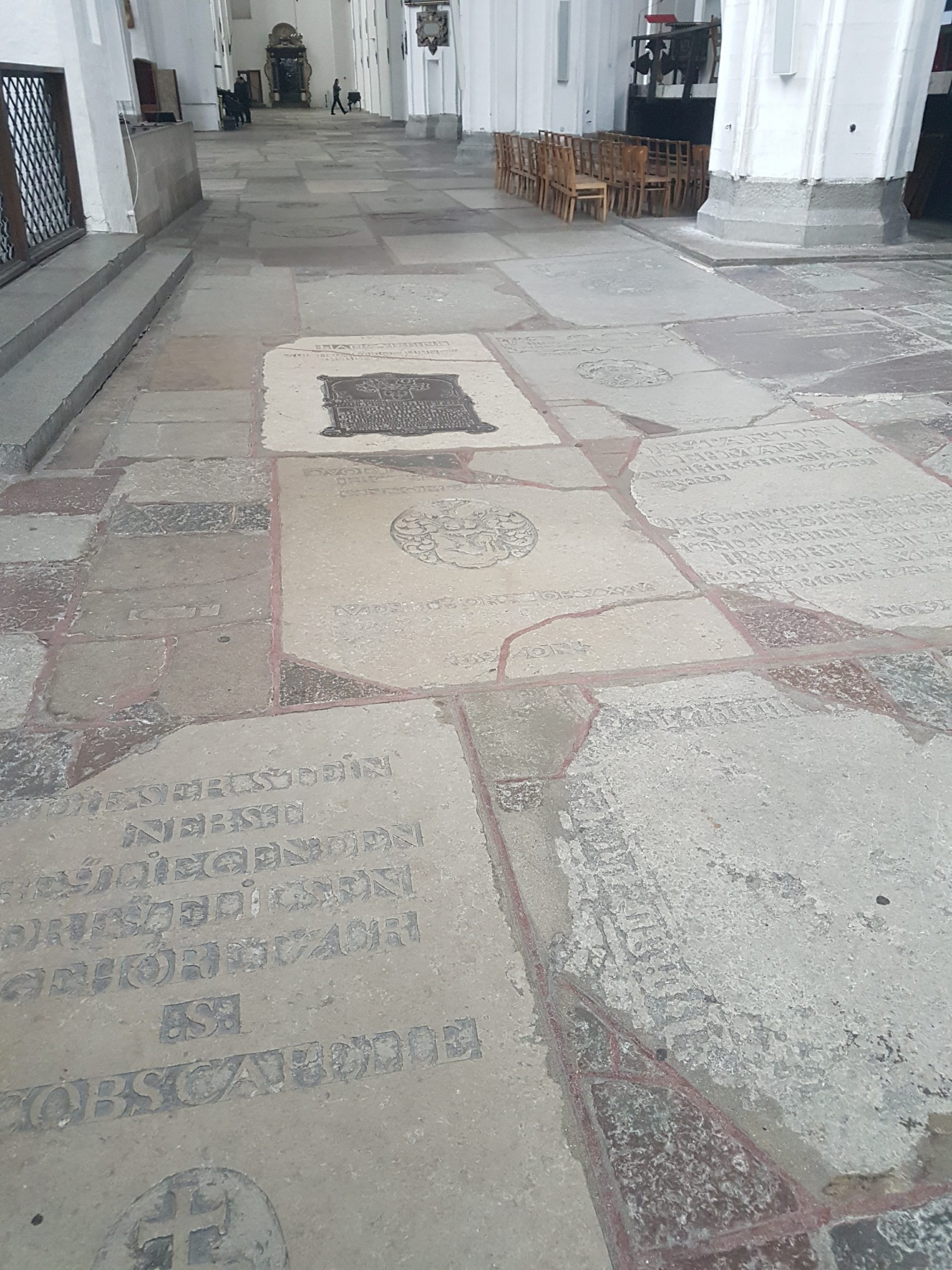 These are tombstones on the floor in St. Mary’s church in Gdansk, lying damaged and smashed. There’s a story that Soviet troops smashed into these tombs during their invasion of the city during the Second World War in an attempt to loot the bodies underneath. I’m unsure whether these stories are true as I can’t find any contemporary mention of that happening, but it’s certainly true that the Soviets did loot the city of Gdansk (or Danzig as it was). It’s also possible that the stones were damaged when parts of the roof collapsed on top of them during the Second World War, but whatever the story, at least some portions of them remain.
