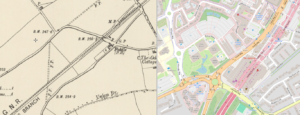 Clicking on this map will make it larger and shows the difference between the 1860s and today (copyright of image to the right is the Open Streetmap project). The cursor on the left hand map is where the JD Wetherspoon outlet is today.