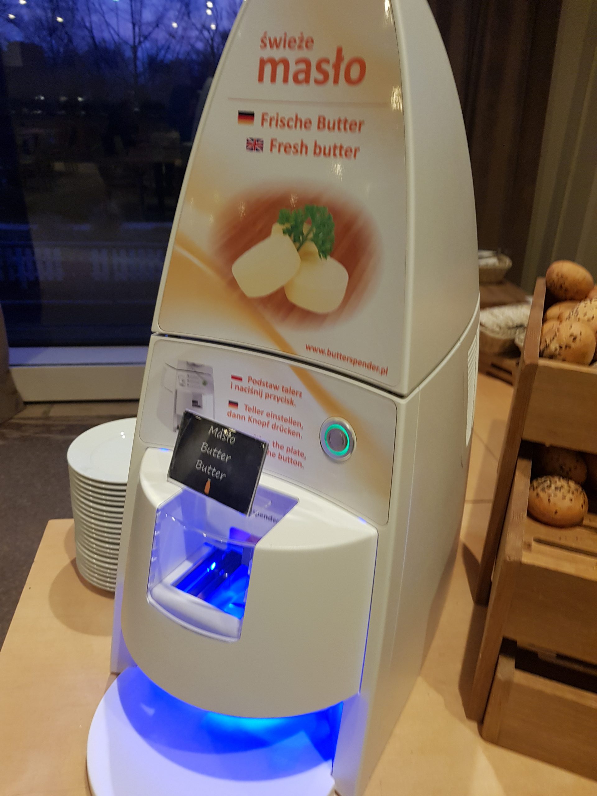 This is the height of sophistication as far as I’m concerned. I couldn’t find the butter, just pots of margarine and I don’t much like the taste of that. I then stumble (not literally) on this machine which is like a little piece of magic. You press the button and a perfectly formed circular disc of butter falls out of the bottom onto a plate. Quite magical and very delicious. No doubt all my posh friends are used to such technology, but I don’t get out much.