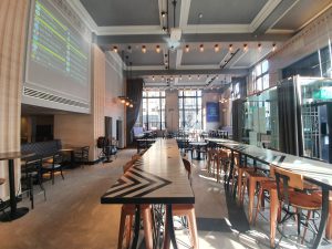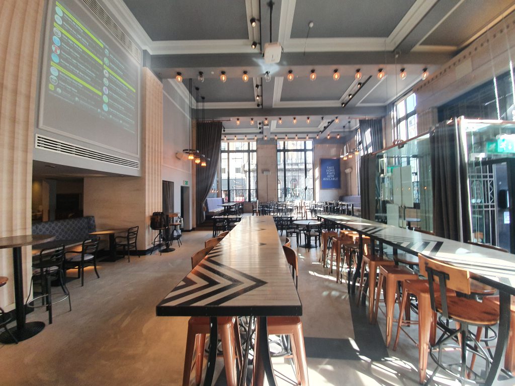 The bar’s interior is bright and airy, another former bank conversion of which there seems to be several in central Glasgow. On the left is a projector screen showing the Untappd menu, but there is also a QR code on the menu to access the same information. I liked the range of higher seating and lower table seating, with everything being clean and comfortable.