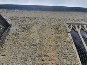 A bricked up early medieval window on the side of the nave and it can also be seen where the walls have been raised during a later stage of building work.