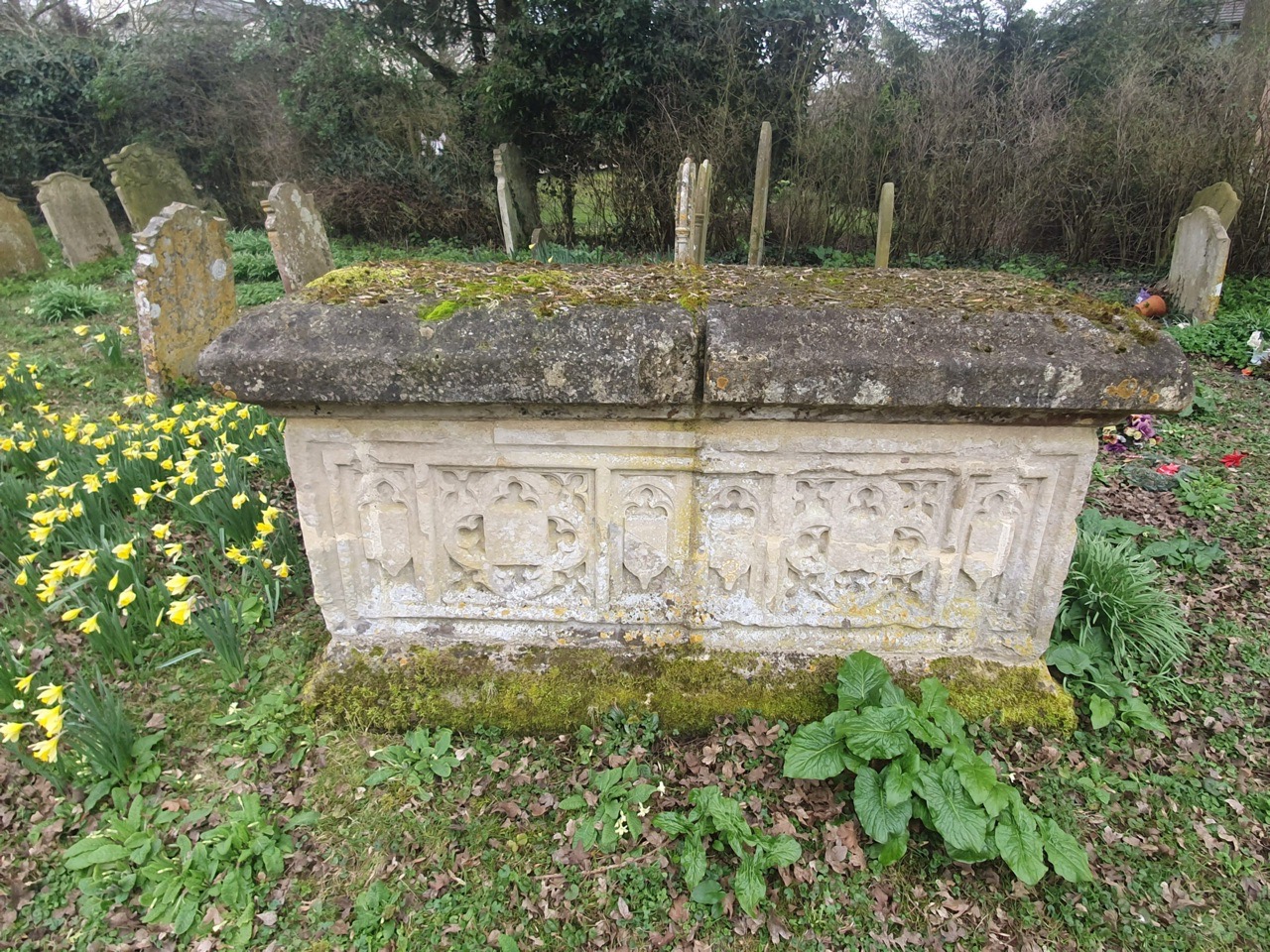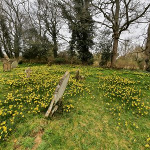 It’s a rather attractive and spacious graveyard with daffodils abound.