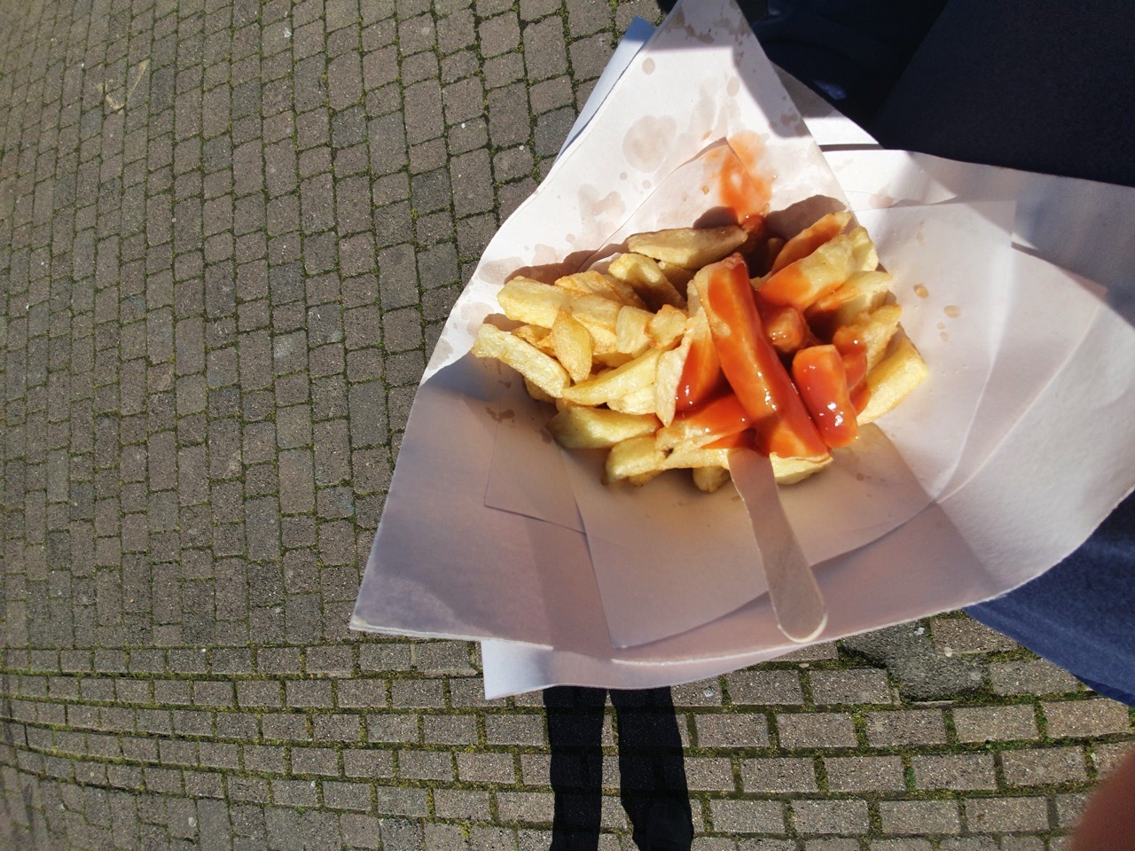 The chips were £1.30, which seemed very reasonable to me, with the sauce being free of charge. I like this policy as I’m easily pleased with free gestures. I really don’t feel that I’m a chips connoisseur, since they mostly all taste the same to me. The ones here were perhaps a little crunchier than their nearby rivals, but they were entirely satisfactory to me. I’m not sure I’d say they were any better or worse than other stalls, but each to their own.
