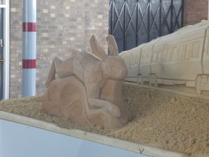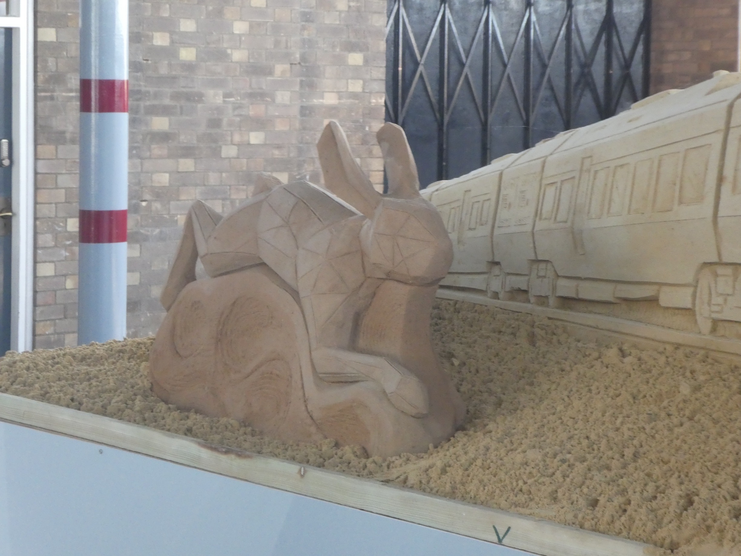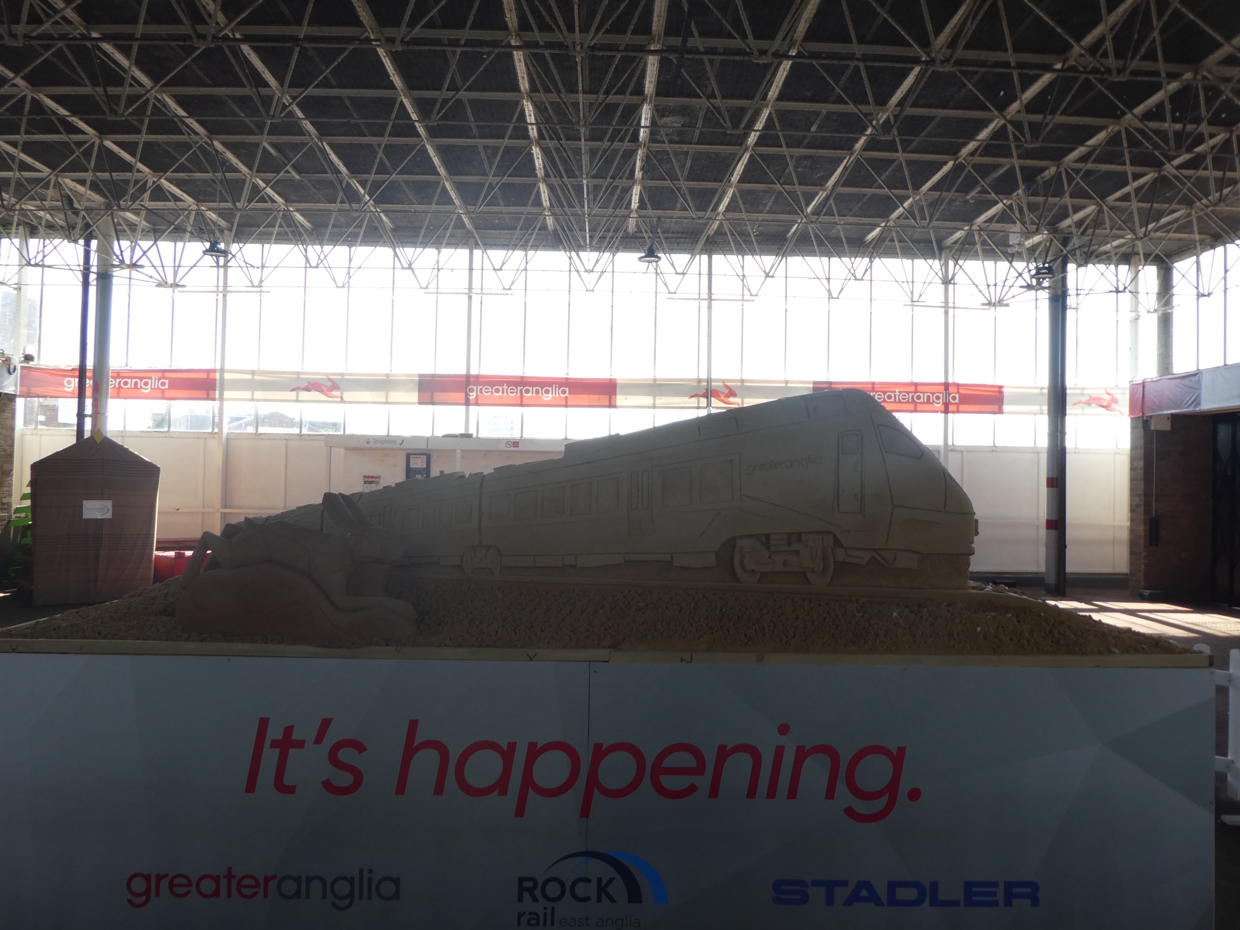 The sand sculpture at Great Yarmouth railway station of the new Stadler trains which are being introduced onto the company’s network of routes. It was created by Richard Spence and Jamie Wardley and I’m partly surprised no local ‘wit’ has fiddled with the sand sculpture.
