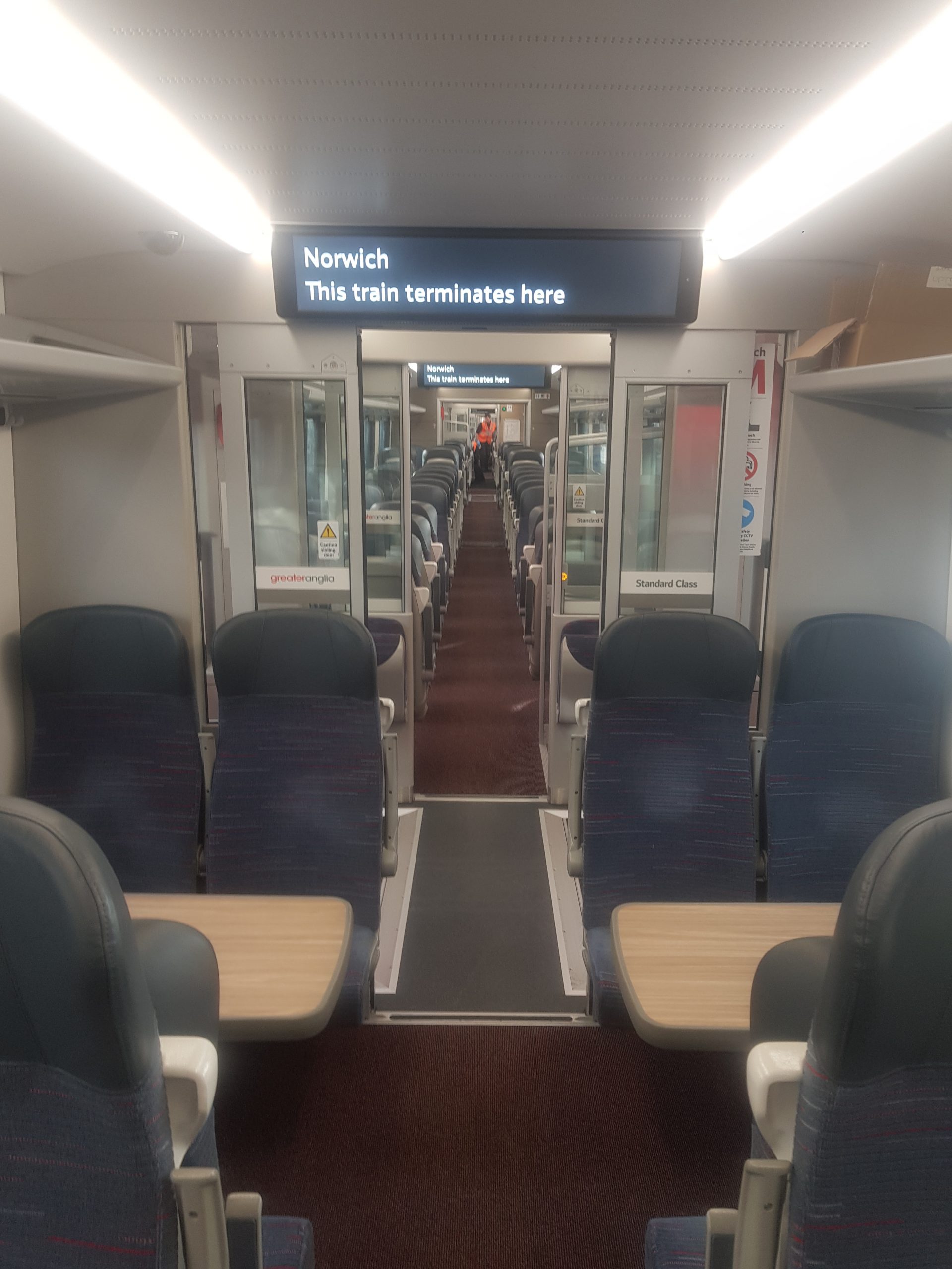 This is the first time that I’ve had chance to go on the new train between Norwich and London Liverpool Street, I seem to have caught the older rolling stock over the last couple of months. The train was the 11:30 from Norwich, which seemed relatively quiet, even though it was taking passengers from the 12:00 service which had been cancelled. The new train has twelve carriages, and they’ve been made by Stadler in Switzerland.