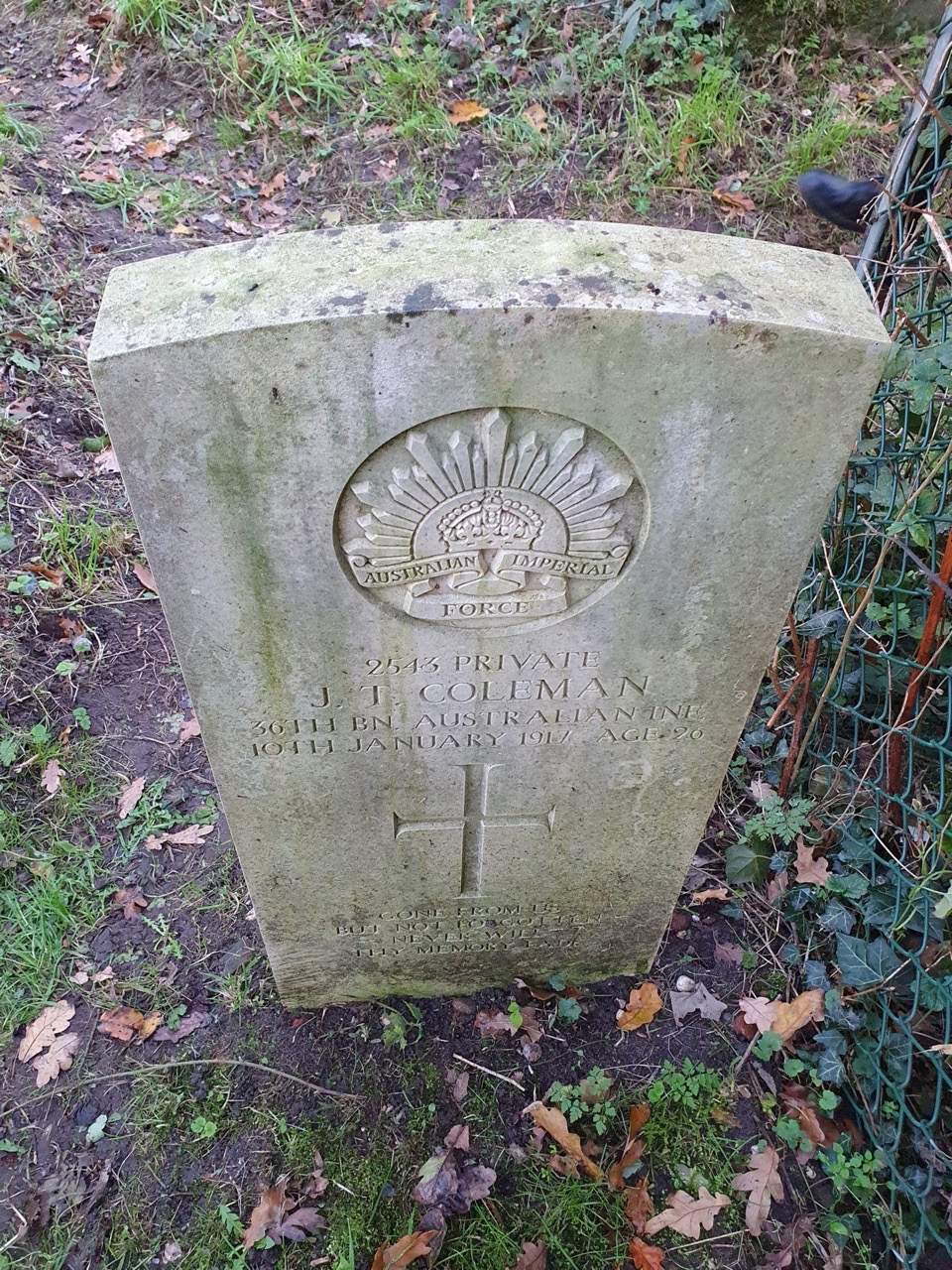 This grave is located to the side of the old All Saints Church in Hainford, next to the fenced off tower. It commemorates the life of John Thomas Coleman, who served in the 36th Battalion of the Australian Infantry. Normally, I’d spend ages faffing around with censuses and newspaper reports to work out what has happened for this Australian man to be buried here.