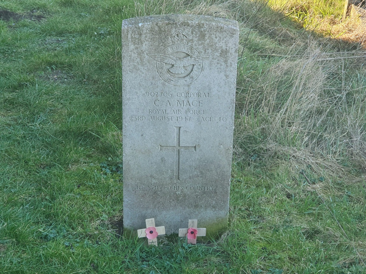 Cecil joined the Royal Air Force Volunteer Reserve, service number 902706, assisting the war effort given his previous military experience. Cecil died on 23 August 1947 at the age of 40. Unfortunately, none of the usual databases give any information as to what happened and it’s rare not to have a cause of death for an airman. There don’t seem to be any media reports of the death, which means it’s probably more likely a death from natural causes rather than being killed in a military accident. I’m also unsure why he was buried at St. Peter’s, which at the time was effectively the church on the airfield, given that he was married, but perhaps it all just felt more appropriate to the family.