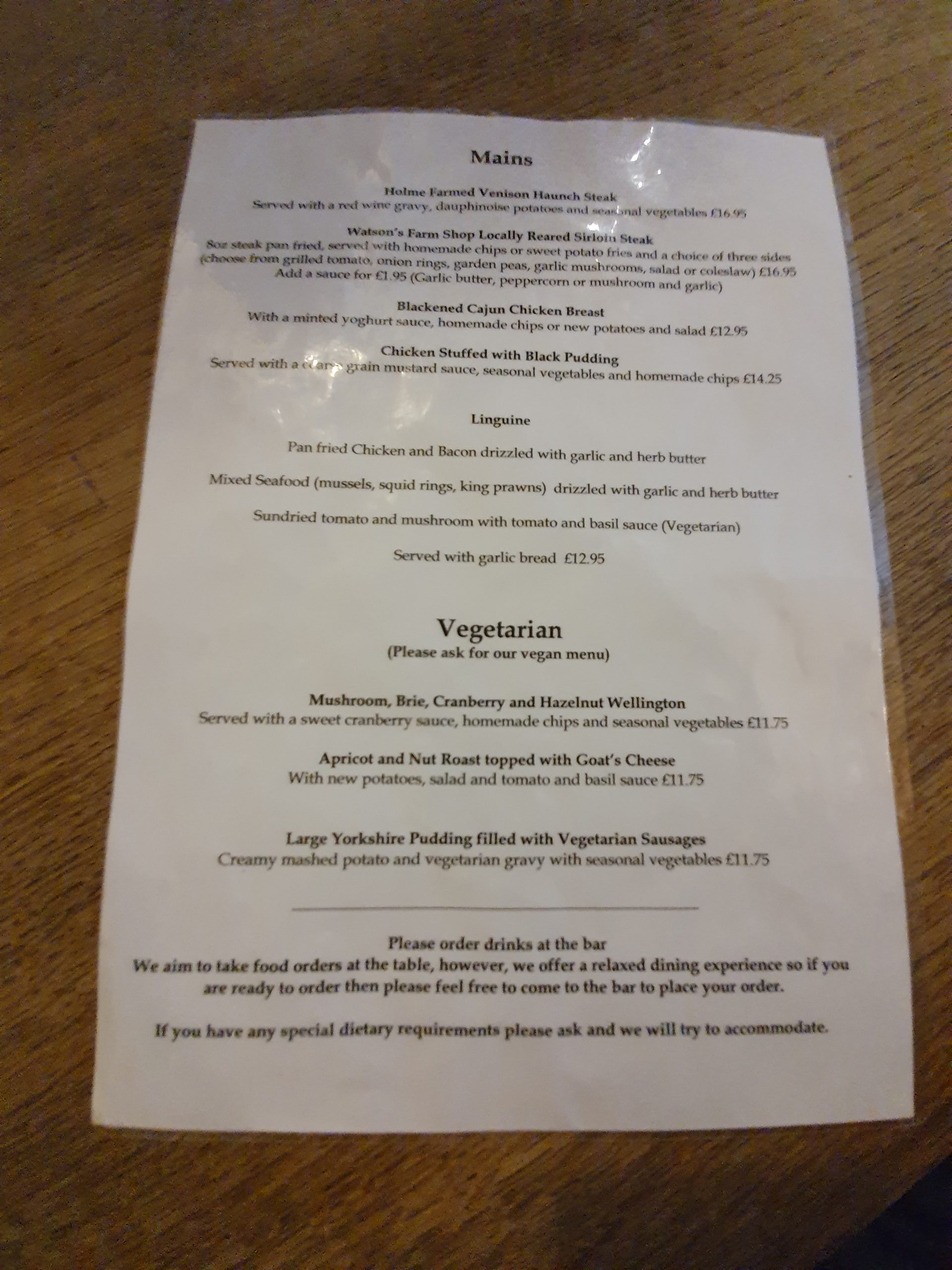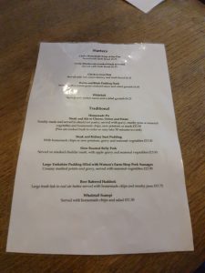 The menu, with primarily traditional British dishes, but an effort has been made to cater for vegetarians.