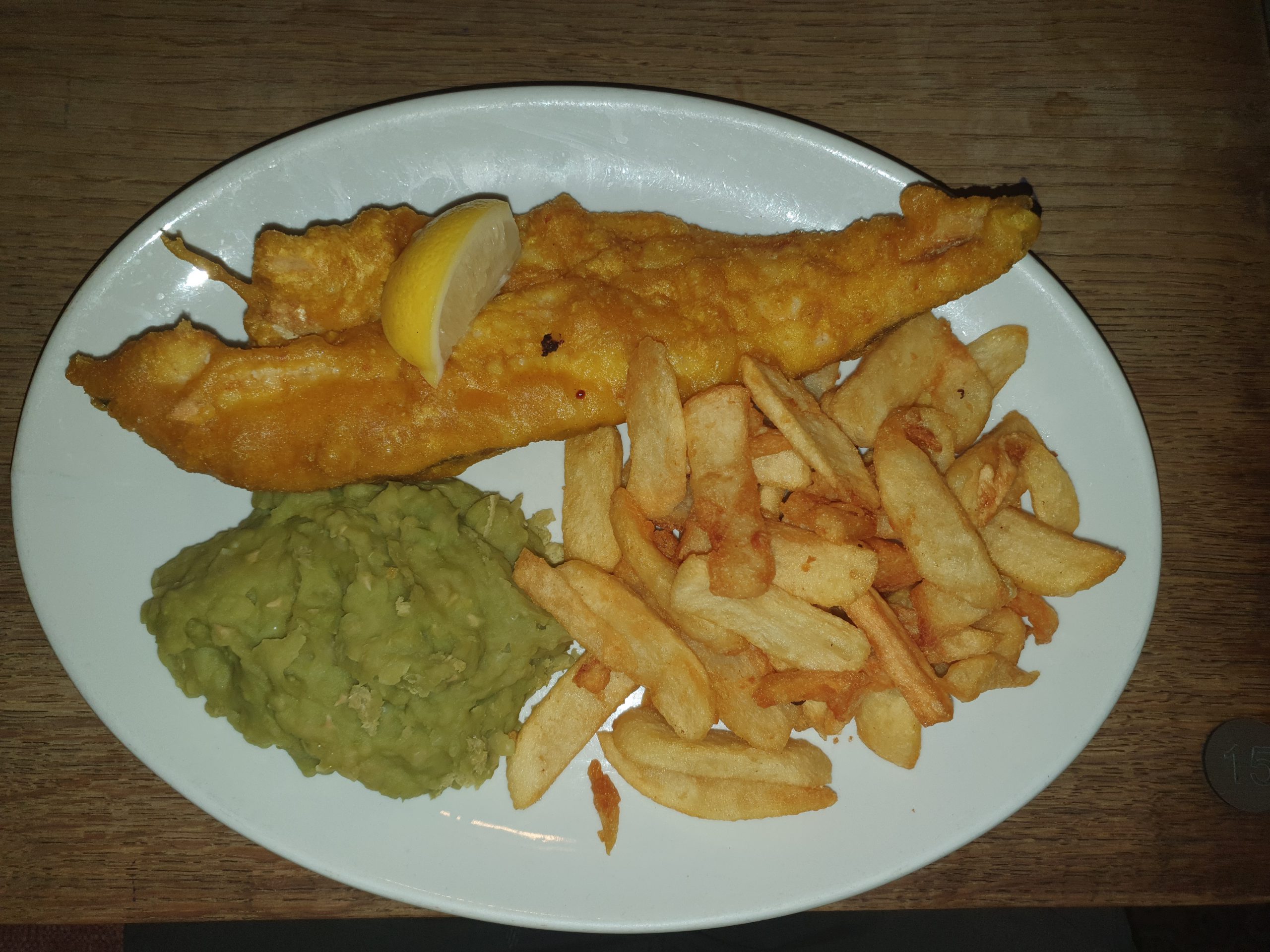 I had the beer-battered haddock, which was moderately expensive at £13.75. The fish was well cooked and tender, with the batter retaining some crunch and having a pleasant flavour. The mushy peas were, as they often are, pretty pointless as they were devoid of flavour, but the chips were homemade and moreish. All very acceptable though and the portion size was towards the generous side.