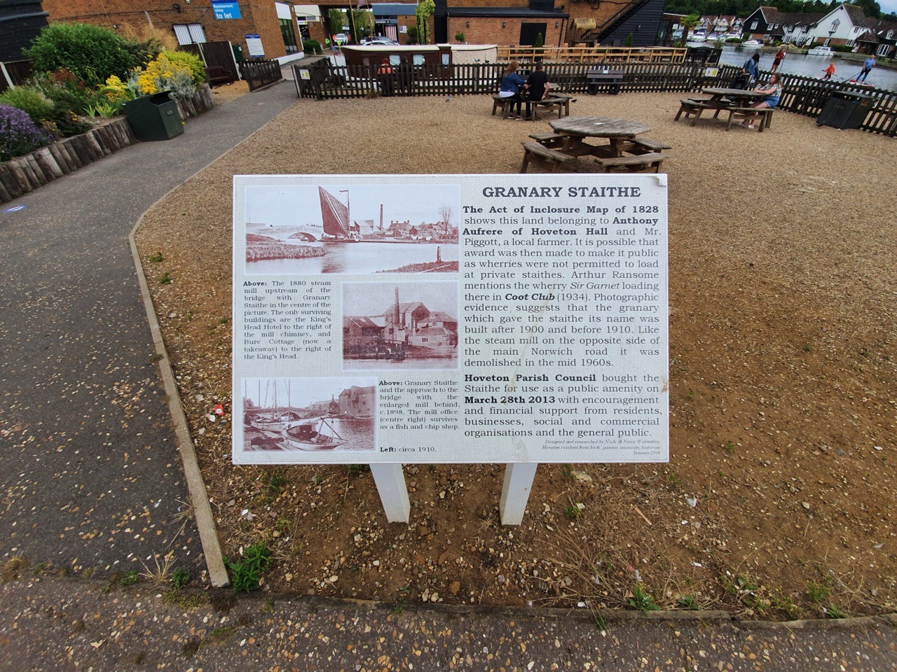 The River Bure, with Granary Staithe on the right. There were concerns in 2012 when the owners of the land, Norfolk County Council, wanted to sell it for £250,000 or lease it for £25,000 per year. The only problem was that the Broads Authority said they’d oppose any building on the site, so plans to make it an attraction or similar wouldn’t have been viable. After some fund-raising, Hoveton Parish Council were able to buy the land and it opened as a public area in March 2013.