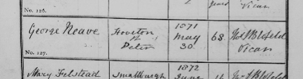 George’s entry in the burials register for the church, the vicar was from the local Blofeld family of Hoveton Hall and the burial took place on Tuesday 30 May 1871. Elizabeth, his wife, was buried with George following her death in 1889, at the age of 85.