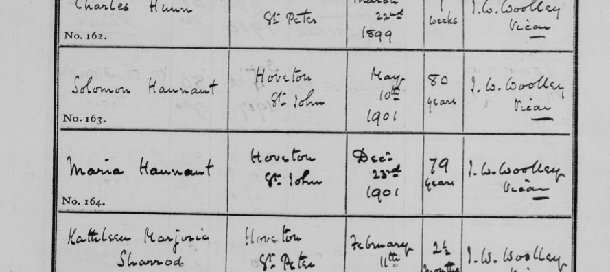 And, with a touch of pathos, here is the burial register for St. Peter’s Church. Solomon was buried on 10 May 1901 and the next burial at the church was that of Maria, on 23 December 1901.