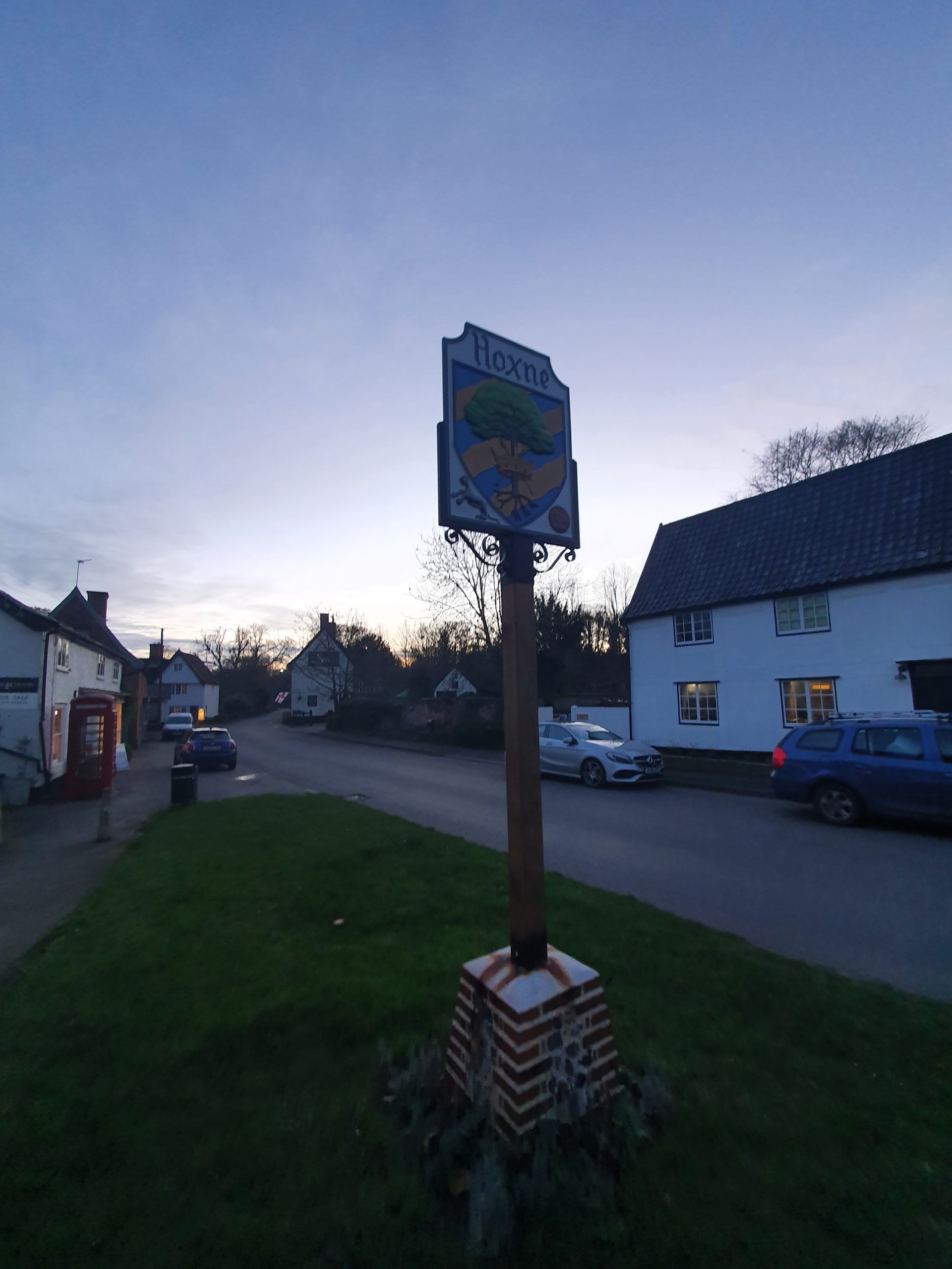 And the village sign, which was only introduced here in 2019. It makes reference in its design to the Hoxne Hoard that was found nearby and also to King Edmund (the King of East Anglia from 855 until his death in 869), who might have been martyred nearby. It would have been a clearer photo if we’d have got round the walk a little quicker I must admit.