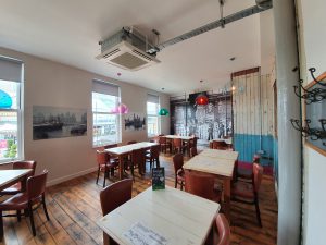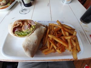 And my meal, I went for a lighter snack of salt and pepper chicken wrap and this was sufficiently well presented. I’m not a big fan of smaller plates as there’s less room to cut things (and one of my fries fell off the plate onto the floor when the waitress placed it down), but the meal was more substantial than it looked when served. The chicken was tender and the fries were very moreish, although I find that they generally are. The others ordered the boar burger, which was apparently also entirely satisfactory which was very pleasing.