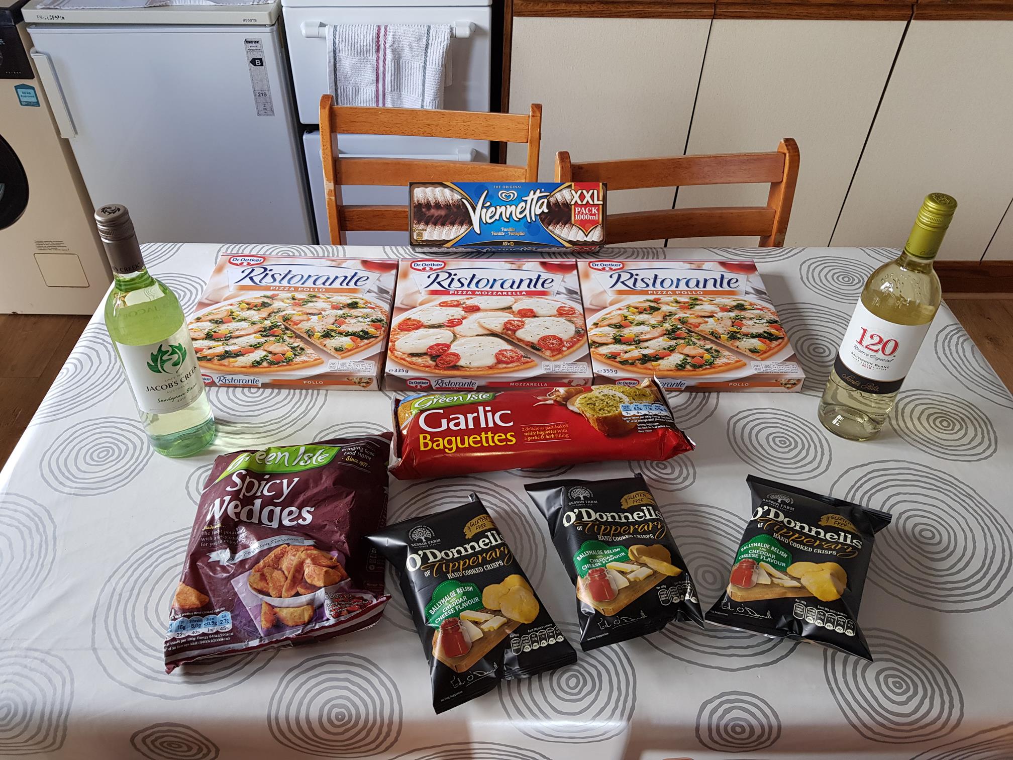 We discovered that they didn’t have much in the way of meat, or indeed vegetables. I wasn’t too bothered by this though as the shop had Dr. Oetker’s pizzas and this sort of food seemed perfect to me. So we purchased three pizzas, potato wedges, two bottles of wine, some crisps (they were my idea) and a Viennetta.