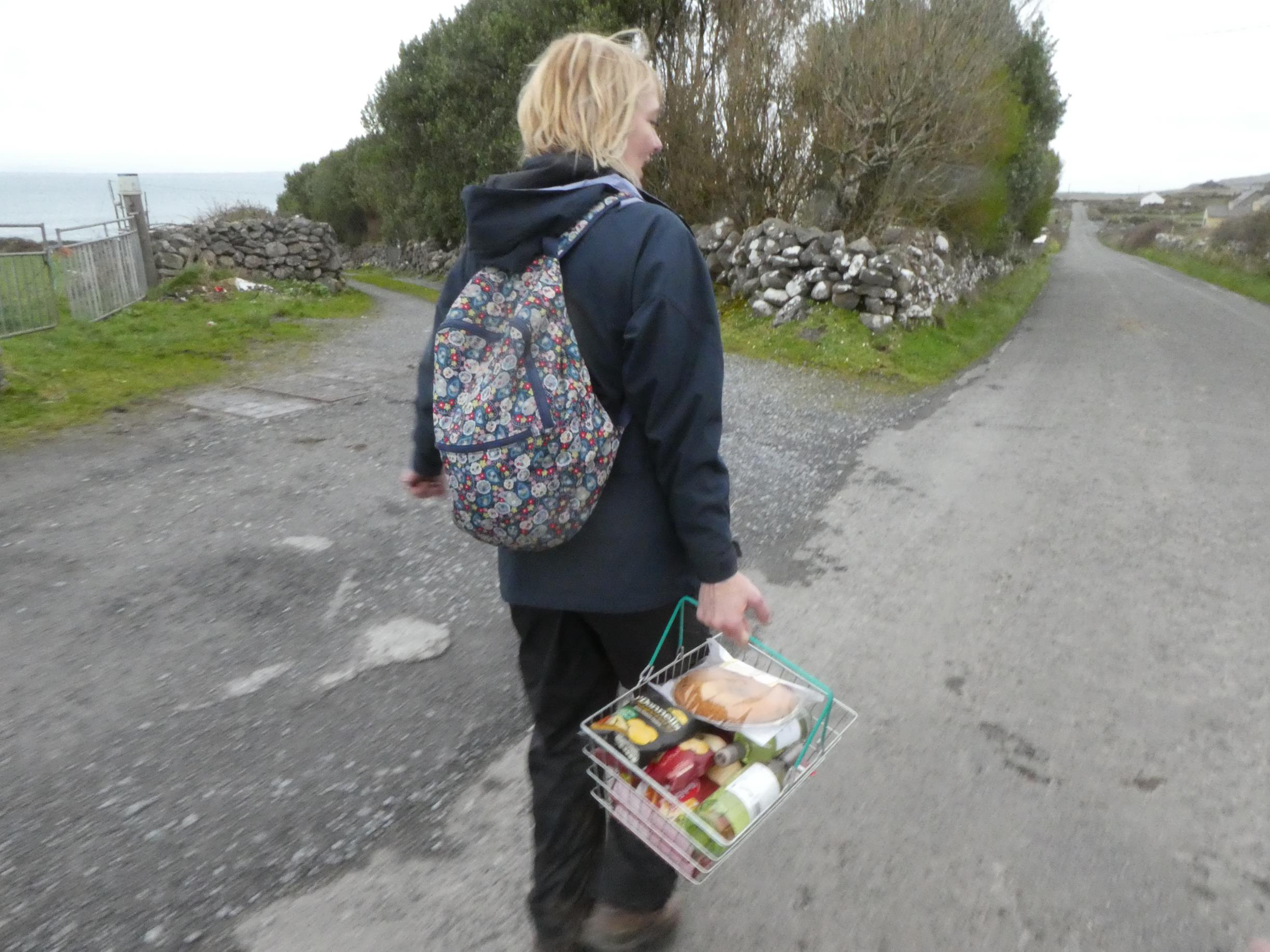 Sarah walking back with our provisions for the evening. We were given permission to take the basket and it was returned by Sarah to the village shop the next morning.