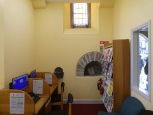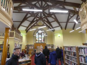 Photos of inside the library, which has been tastefully converted and which has retained numerous features from the original building. There are books on the balcony area, although this section was closed off to the public when we were there.