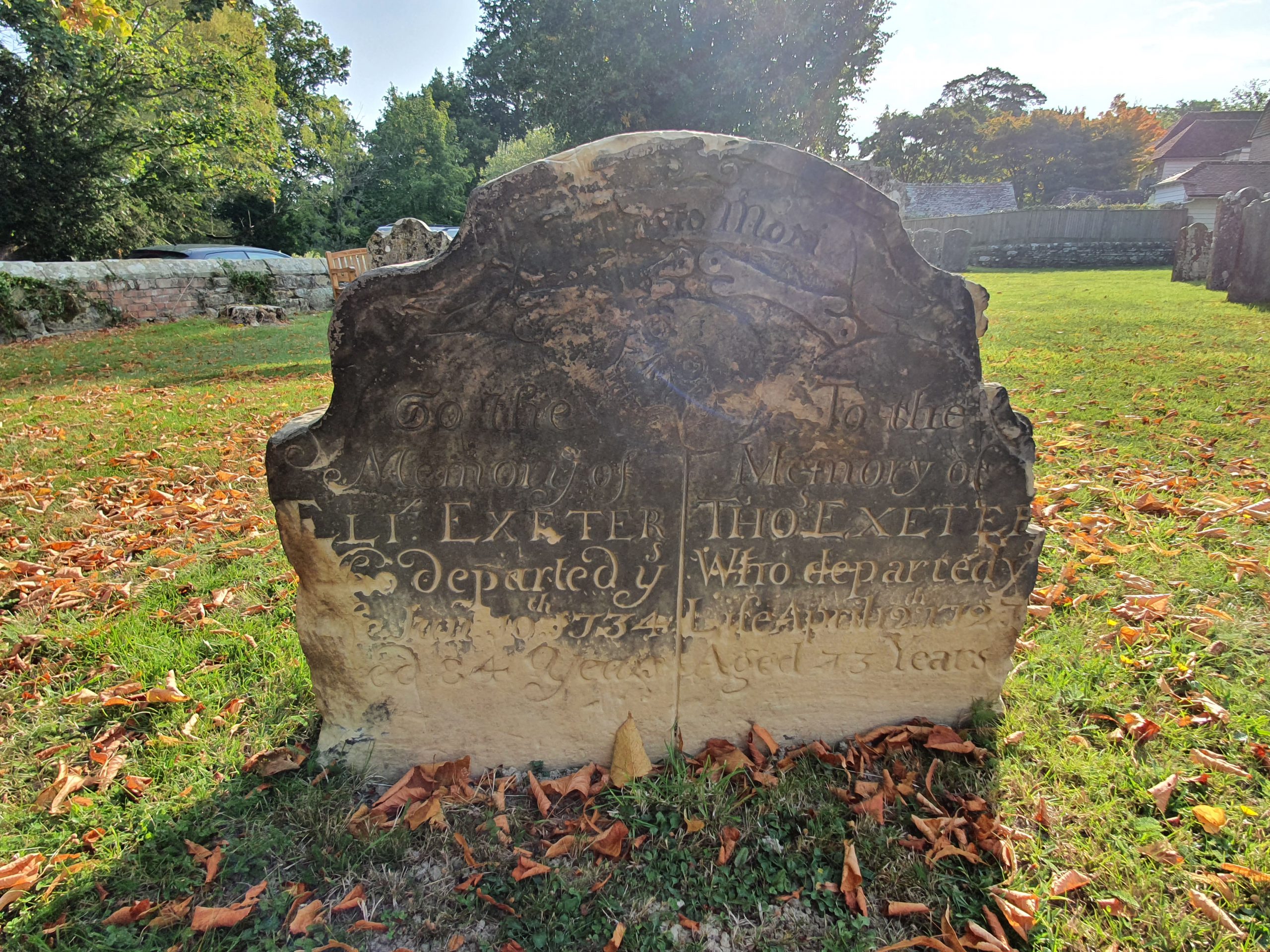 I’m slightly puzzled how this grave has remained in such good condition, or at least the top section of it, give that it’s nearly 300 years old. It marks the burial of Thomas Exeter of the town, who died on 12 April 1727 at the age of 43. The burial records survive and note that he was buried on Monday 17 April 1727.
