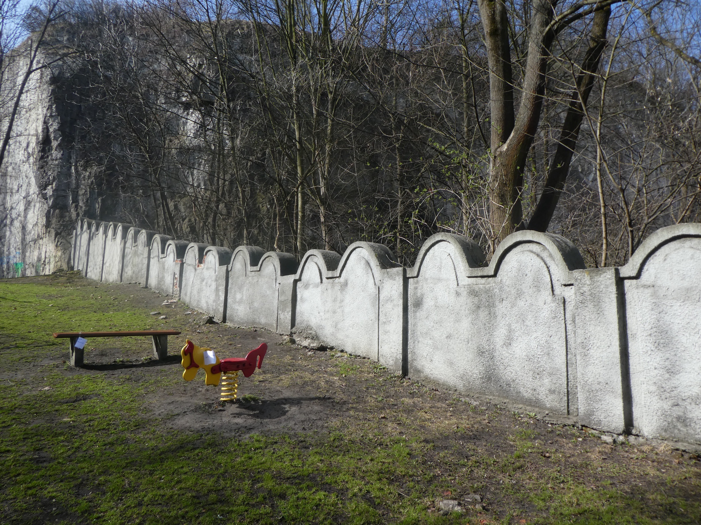 There are, to my knowledge, two intact sections of ghetto wall left in Krakow, and this is the longest section which is located at ulica Limanowskiego. Looking at this remnant now, it is a sobering juxtaposition having a children’s playground located next to the wall.