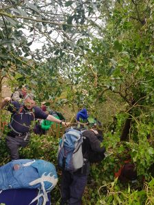 This was an exciting post-lunch challenge that we hadn’t expected, a tree which had fallen across the path. Walkers had a choice, they could either climb under the tree and crawl through foliage, or go over the top. Another walker took my backpack whilst I did the former, but Richard ploughed on over the top and I won’t mention he nearly fell over.