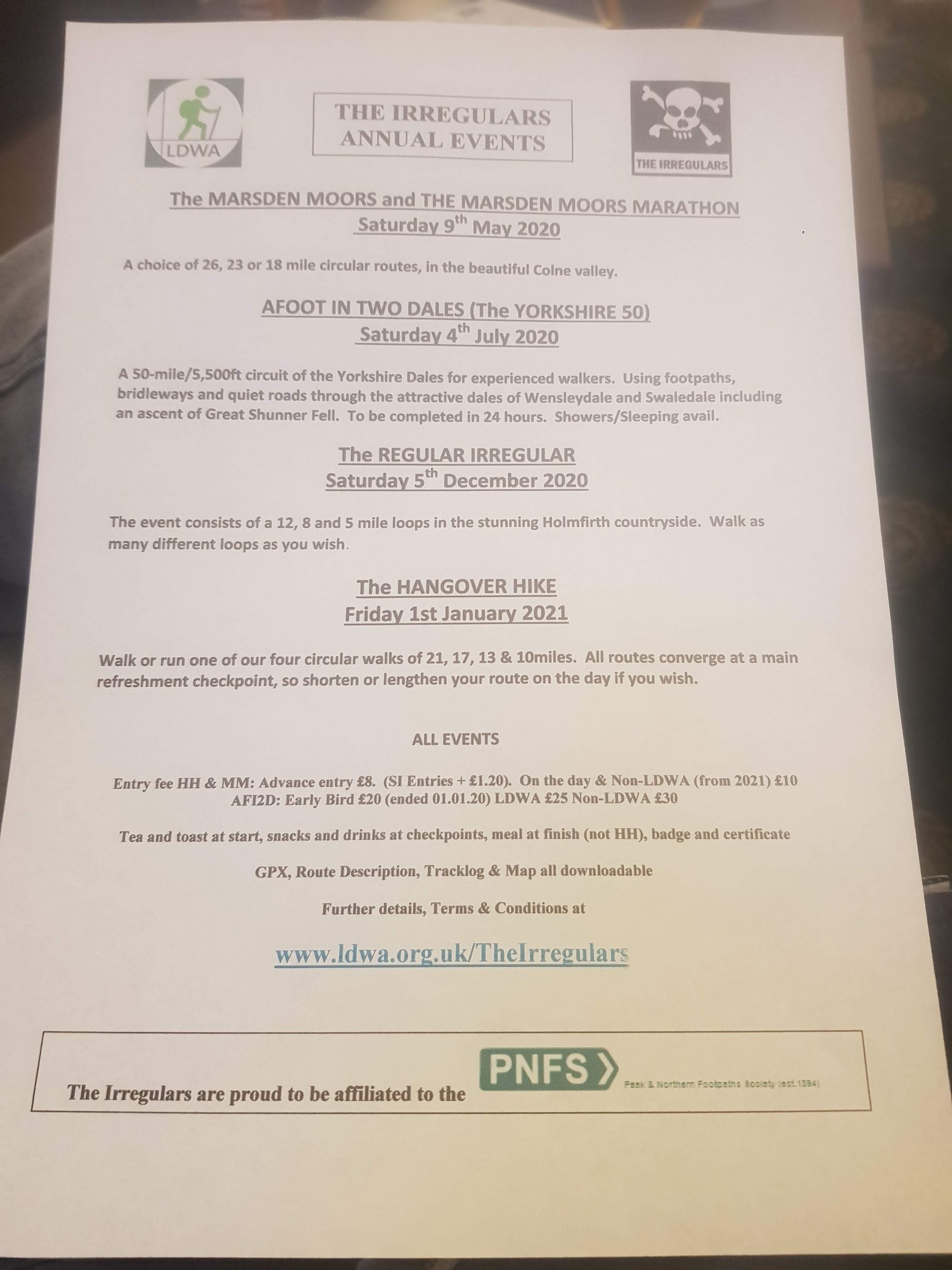 This flyer from the Irregulars reminded me that I’d be walking the Afoot in Two Dales in a few weeks. Well, I won’t now unless things change, maybe next year though (there’s going to be a lot on next year at this rate). I’ve still only walked one 50-mile event, which I accept is a poor effort, but I’ll get round to more. I’m mostly inspired by Simon H, as anything he can do, I’m definitely positive that I can.