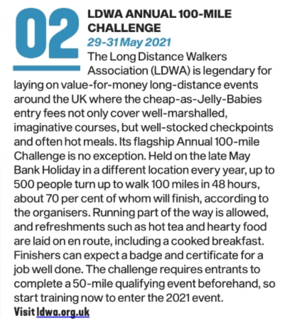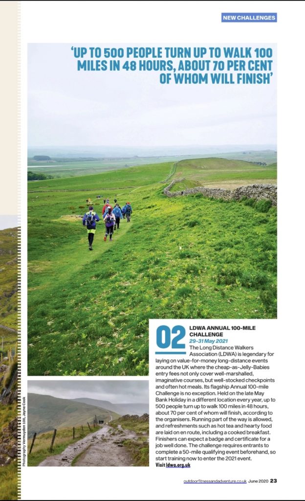 And a very nice little piece in this month’s Outdoors Fitness and Adventure magazine about the 2021 LDWA 100. The photo is the one I sent from Norfolk & Suffolk’s very own Jayne Cook, with the helpful journalist changing the text at the last minute as we finalised where next year’s 100 would actually be held given the impact of Covid-19……