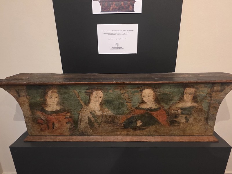 But, I like what’s left, clearly unrestored (unless it has been restored very badly) so it feels like it retains its authenticity. There’s a photo of the whole altarpiece at https://www.stadtmuseum.leipzig.de/DE-MUS-853418/objekt=PS000136 and I’ve learned that the base (so, the bit that’s actually still on display in the museum) is called a predella.