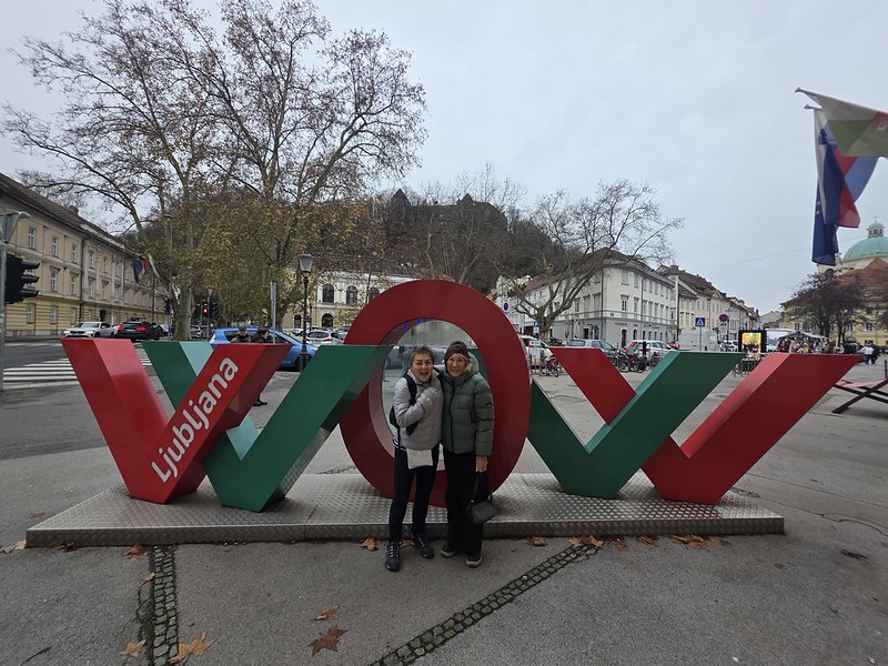 Here’s Susanna and Bev, I’ll let my loyal blog readers establish which one was complaining about the cold again. Note that the central O in this sign is a water feature, although that might not be entirely obvious from the photo as the young ladies are standing in front of it.