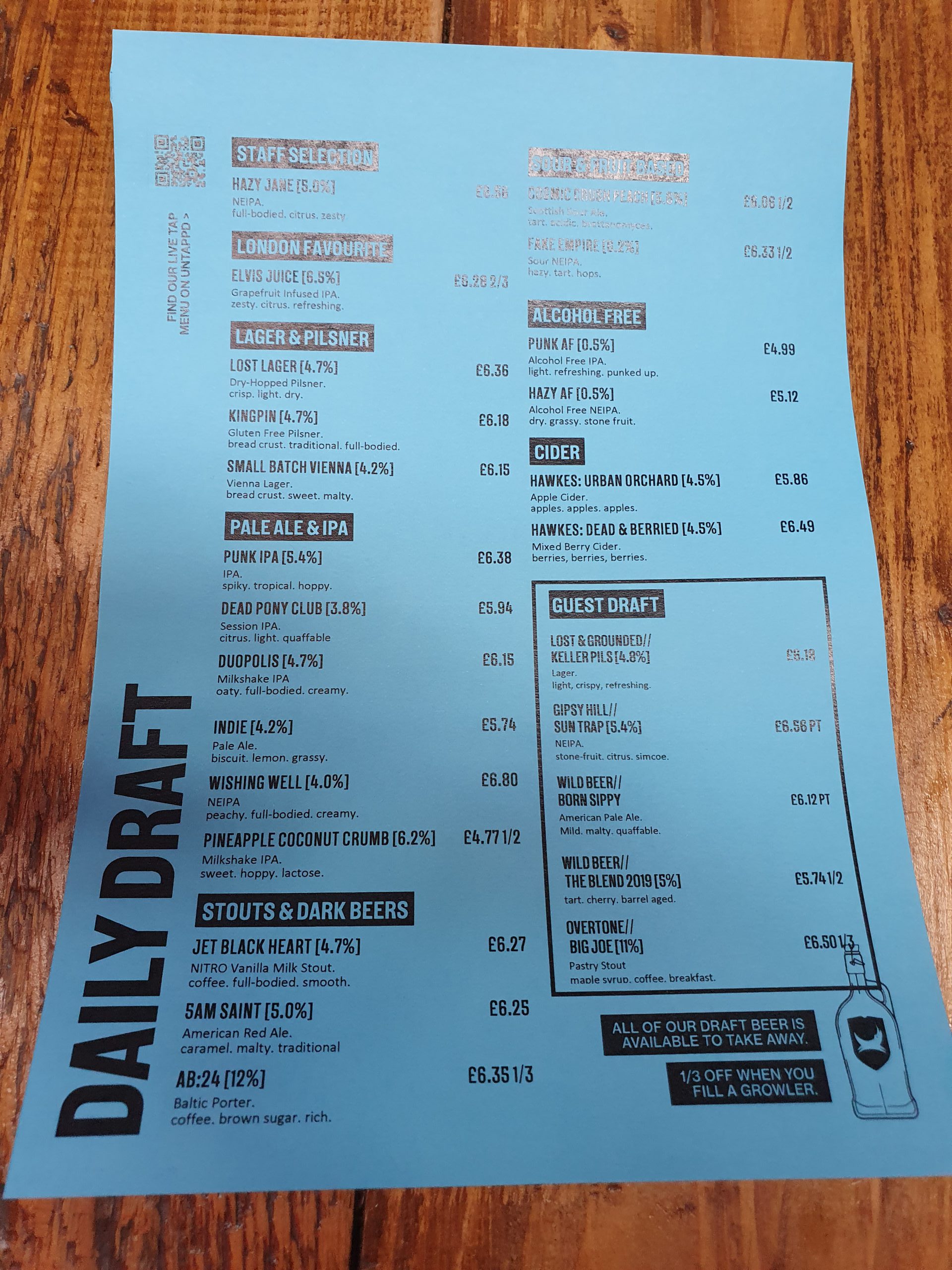 The beer list and although the Big Joe by Overtone sounded exciting it came in at £6.50 for just a third of a pint, so I was more moderate and opted for Brewdog’s own Pineapple Coconut Crumb that I haven’t had before. I wish more pubs offered a beer list like this, or perhaps had a stab at just managing not to stock every bland IPA they can possibly find on their beer list. Looking at Greene King pubs here…. And Marstons….